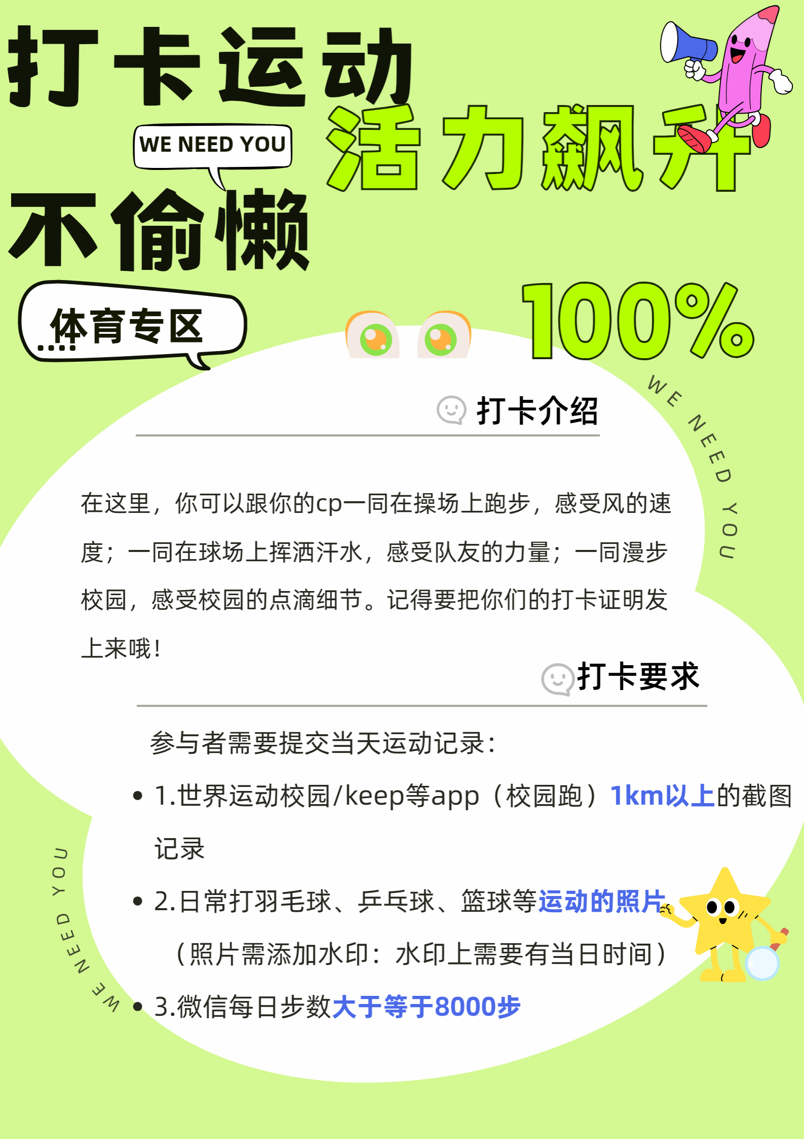8.选择体育专区,配速需在4-10之间,数据不匹配视为不合格。若期间出现下雨无法提交运动记录截图,可按主办方通知切换其他专区任务替代;选择生活专区的,需要自己安排好自律计划时间和打卡时间,如11月11日打卡,则需要上传11月10日的屏幕使用时间截图;选择学习专区笔记需标注当日日期+姓名学号,专注时长类打卡有效时长需≥3小时。