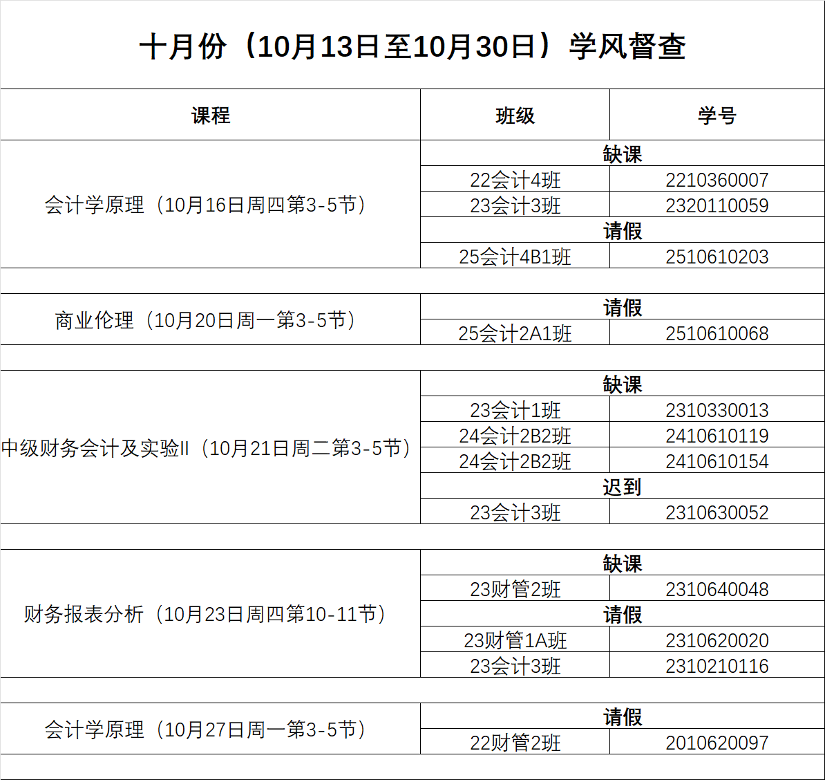 太阳成集团tyc71112025-2026学年第一学期十月份学风督查通报