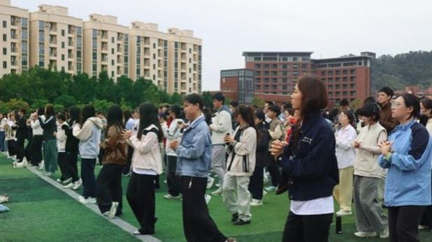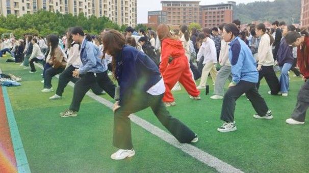 在朋辈辅导员梁俊龙、李传韵的带领下,全体师生有序开展热身运动。简单有力的动作驱散了清晨的微凉,大家精神抖擞,整装待发。