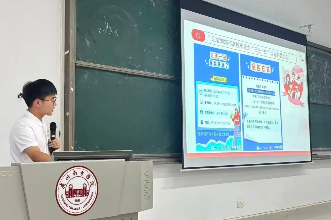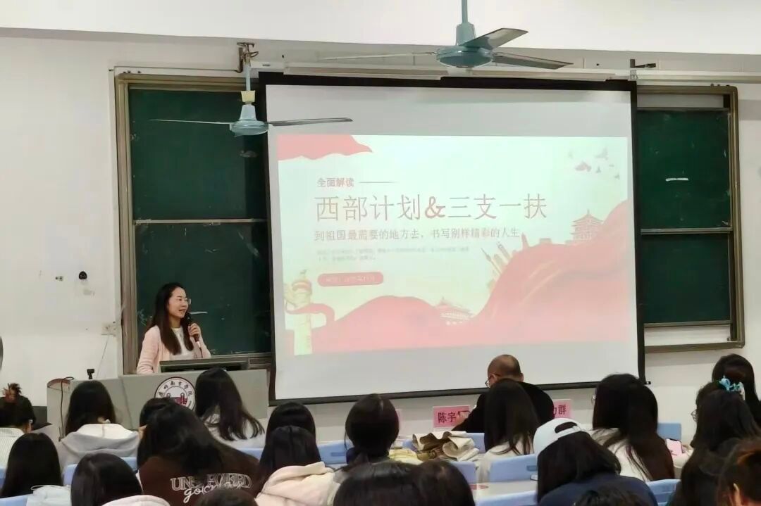 在基层服务项目解读环节,辅导员陈静雯老师与赵帅老师全面介绍了 “三支一扶” 计划与大学生志愿服务西部计划的招募条件、报名流程、服务内容及政策保障。她们重点讲解了两项计划在考研加分、应届生身份保留、学费补偿等方面的优待政策,鼓励同学们积极投身基层服务,在实践中锤炼本领、实现价值。互动交流环节中,老师们针对毕业生提出的就业协议签订、职业填报、基层服务项目岗位选择等问题逐一解答,现场氛围热烈。