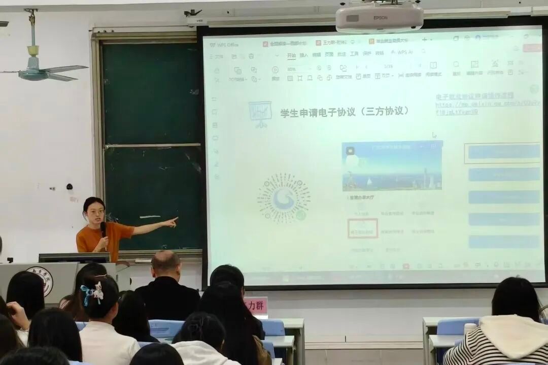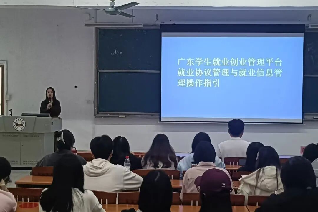 随后,毕业班辅导员王力群老师与陈静菲老师分别在两个会场开展毕业生就业系统操作指引讲解。她们详细演示了 “广东学生就业创业” 微信小程序的使用流程,重点解读了电子就业协议申请、填写规范、审核要点及就业信息上报等核心操作,针对协议试用期、档案去向、违约金设定等常见问题进行专项说明,帮助同学们熟练掌握就业手续办理流程。