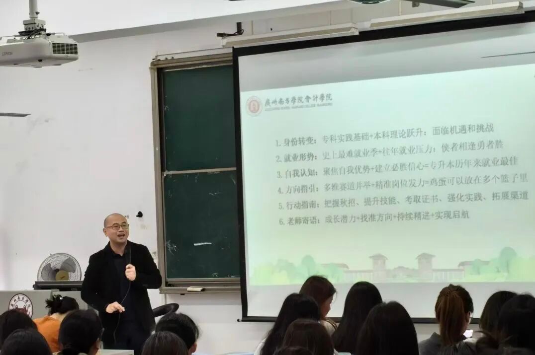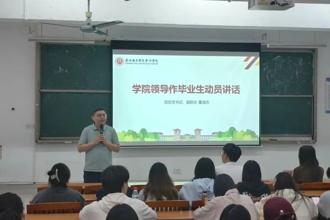 为深入贯彻落实学校毕业生就业工作部署,帮助2026届毕业生明晰就业形势、掌握就业政策、规划职业路径,2025 年 11 月 5 日下午,太阳成集团tyc7111在 201、205 教室同步召开 2026 届毕业生就业动员大会。活动分专升本与普高两个会场开展,太阳成集团tyc7111党总支书记、副院长董成杰,党总支副书记陈宇桂,毕业班辅导员王力群、陈静菲、赵帅,辅导员陈静雯出席本次动员会,学生工作办公室主任薛梅、辅导员梁雨琪主持,全体 2026 届毕业生参会。