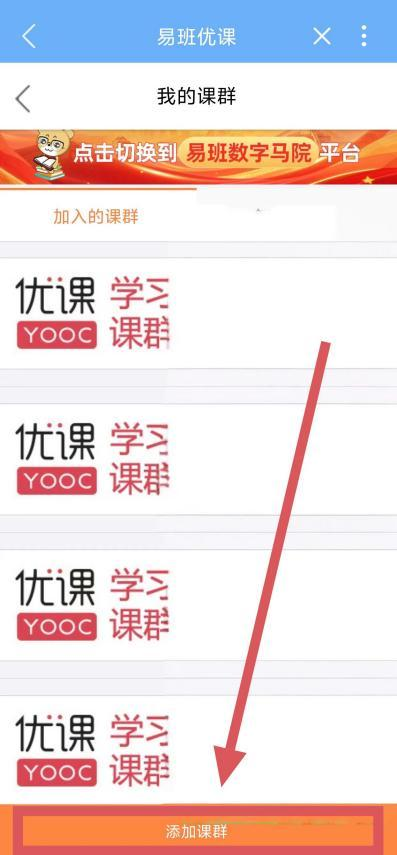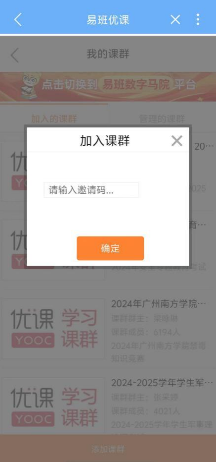 ③在我加入的课群点击【添加课群】 ,输入课群邀请码【9U48FA8V】,进入课群“广州南方学院合格评估应知应会知识测试 ”