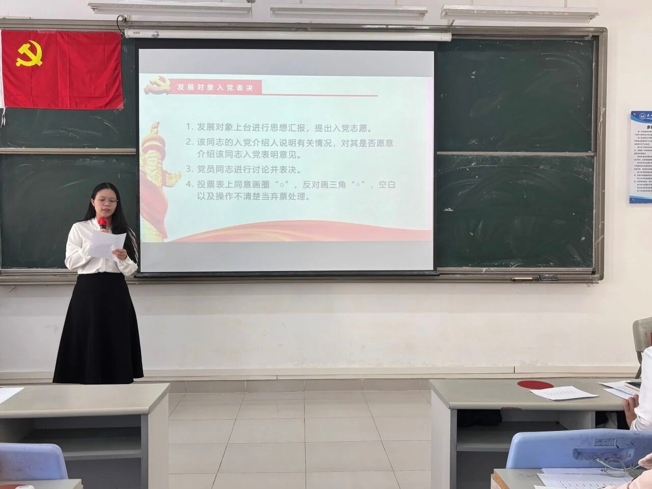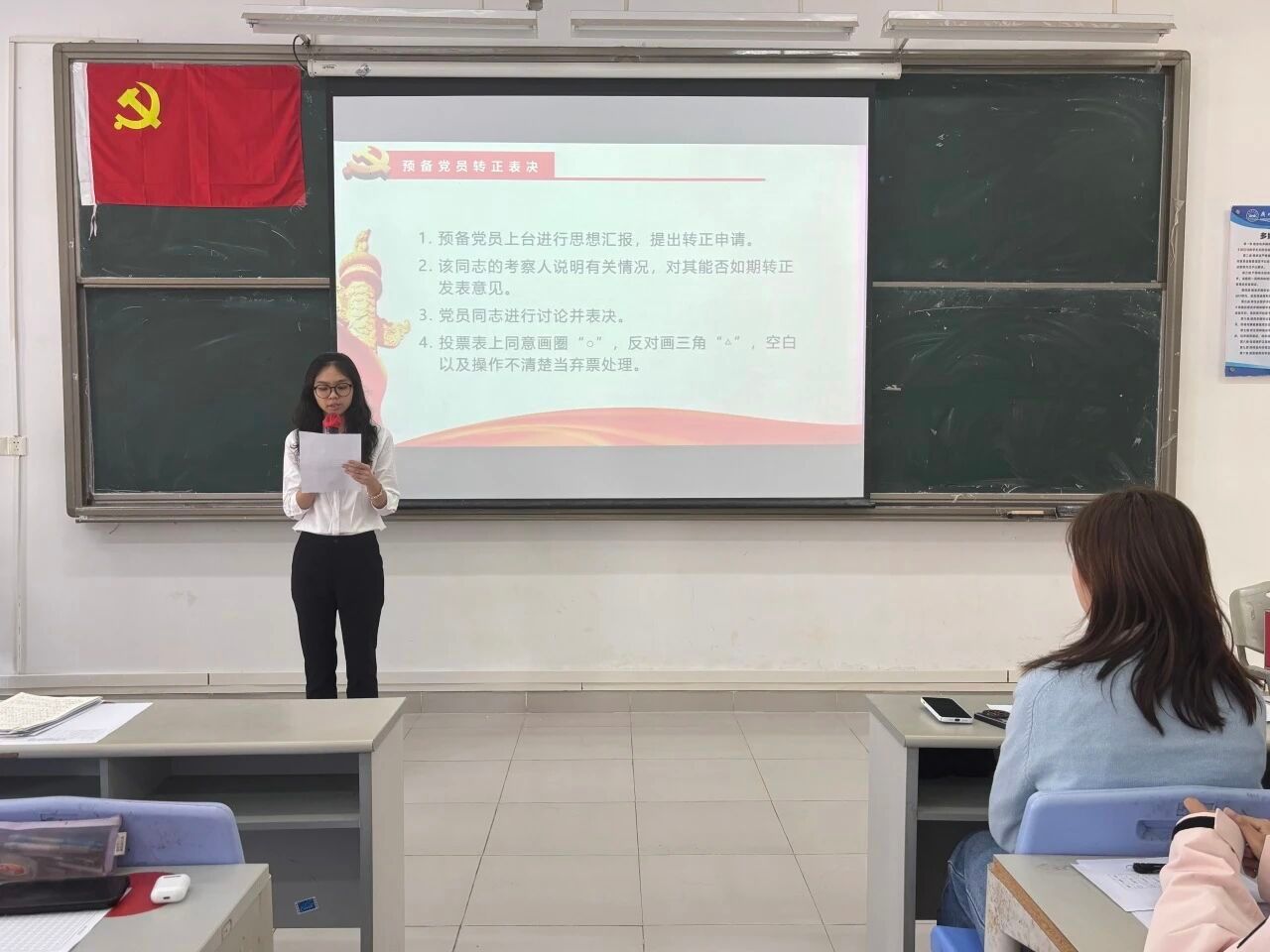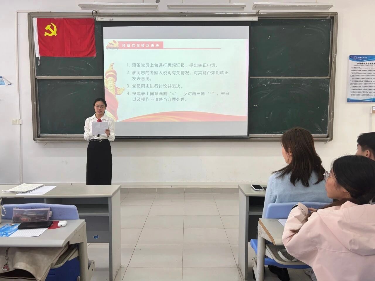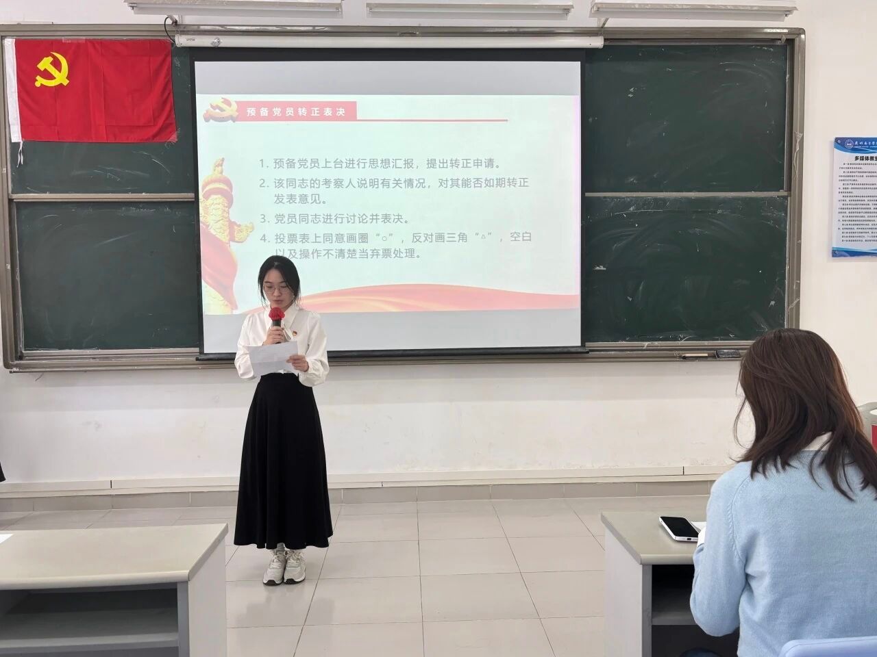 大会的第四项议程:宣读表决情况。经过与会正式党员的无记名投票表决,同意接收发展对象严静怡等5名同志顺利转为预备党员和预备党员罗庆霜等7名同志顺利转为中共正式党员。