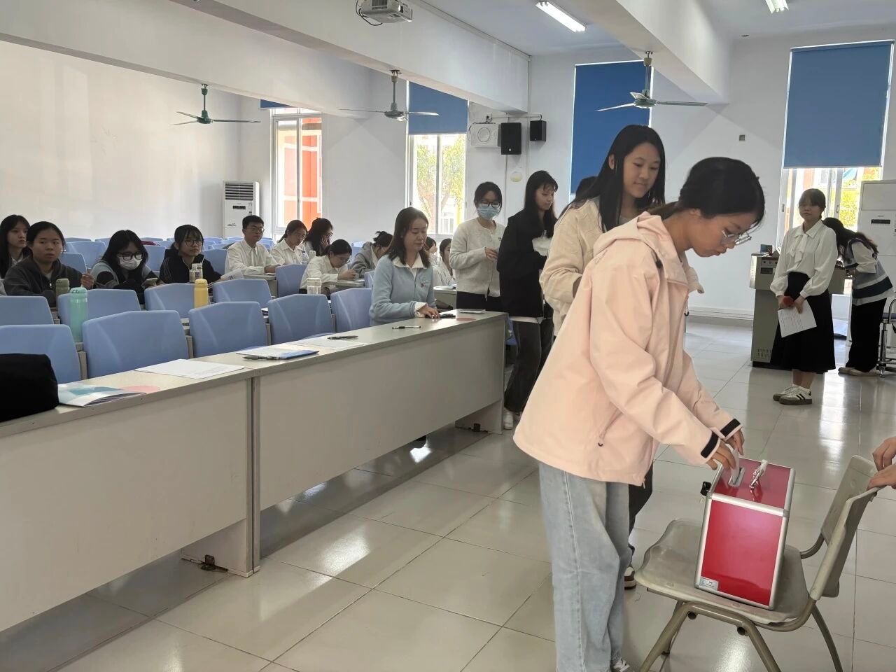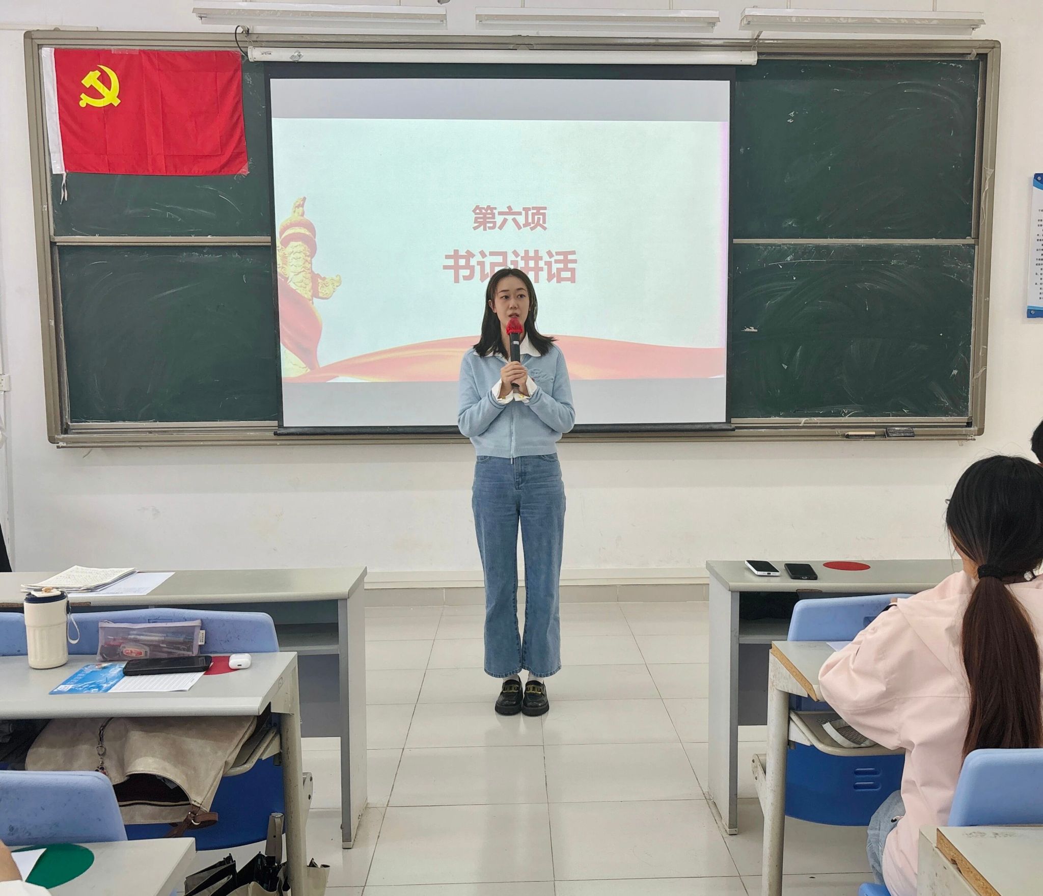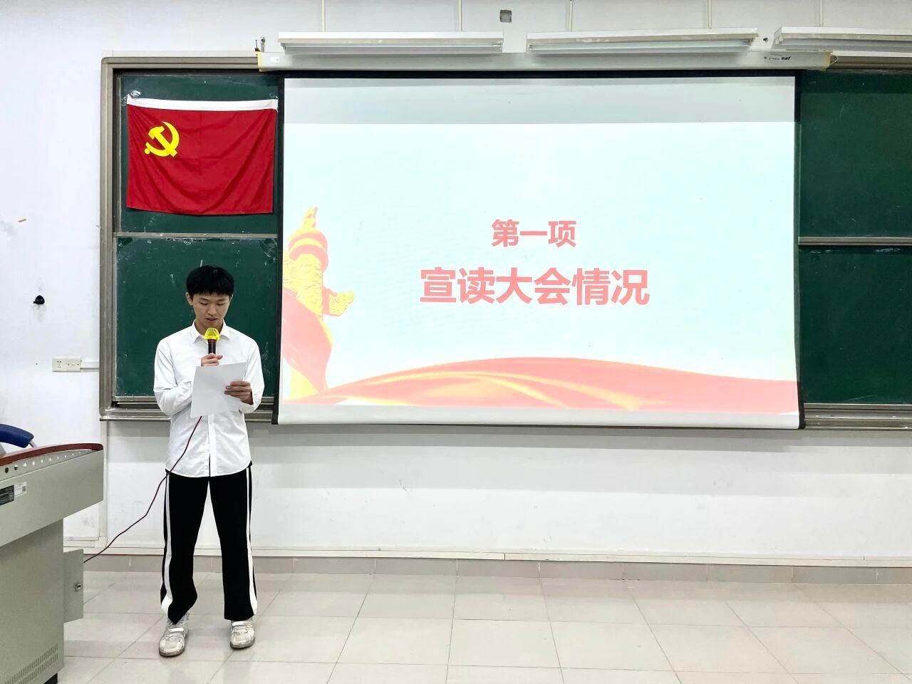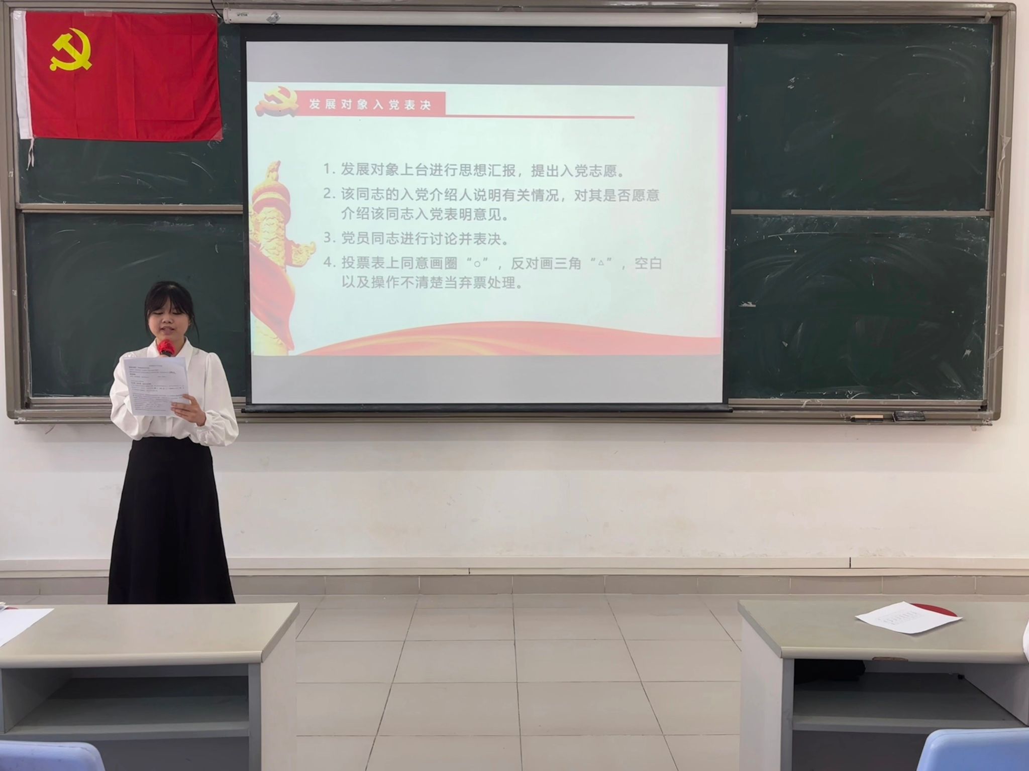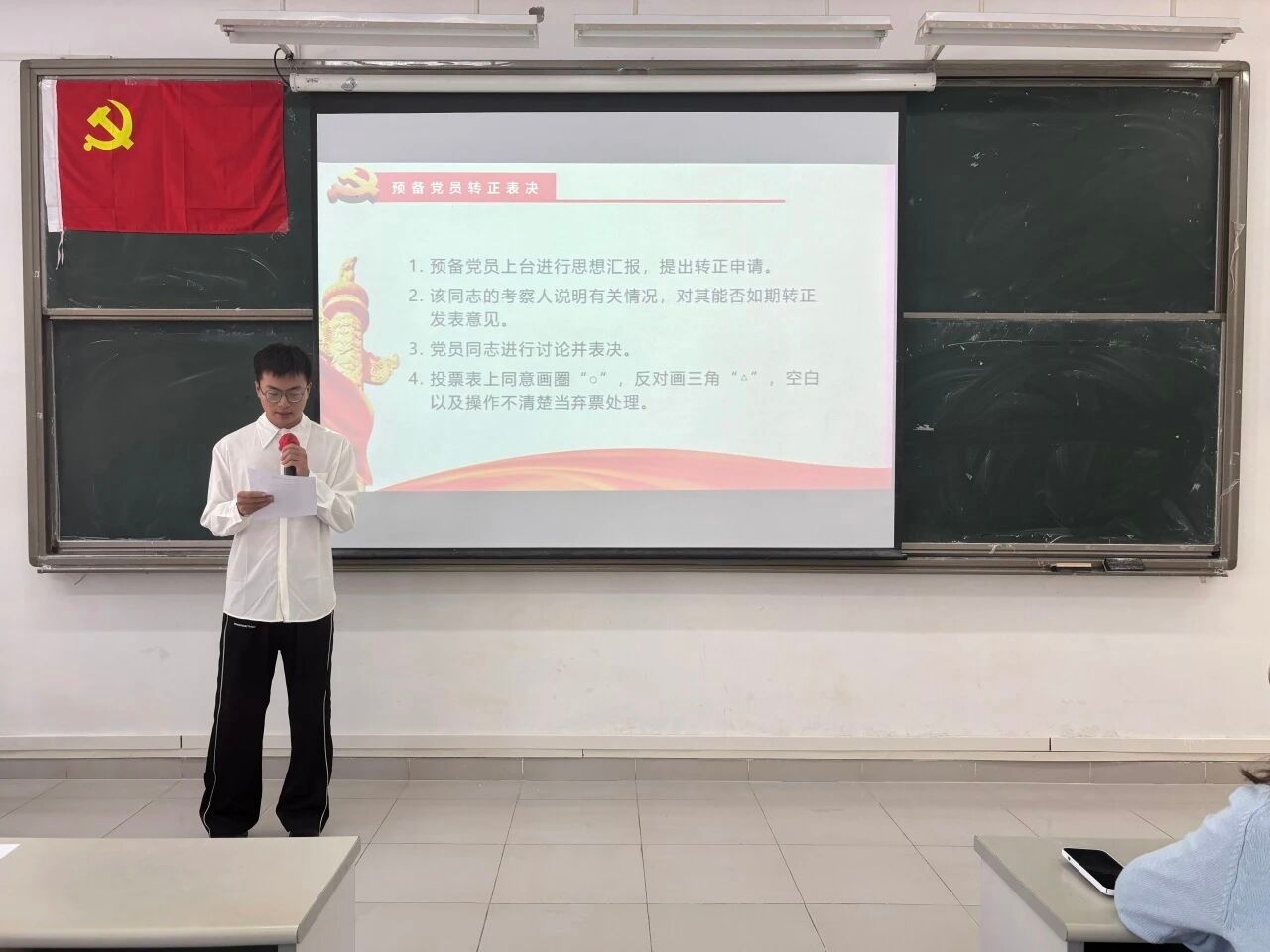 大会的第四项议程:宣读表决情况。经过与会正式党员的无记名投票表决,同意接收发展对象严静怡等5名同志顺利转为预备党员和预备党员罗庆霜等7名同志顺利转为中共正式党员。