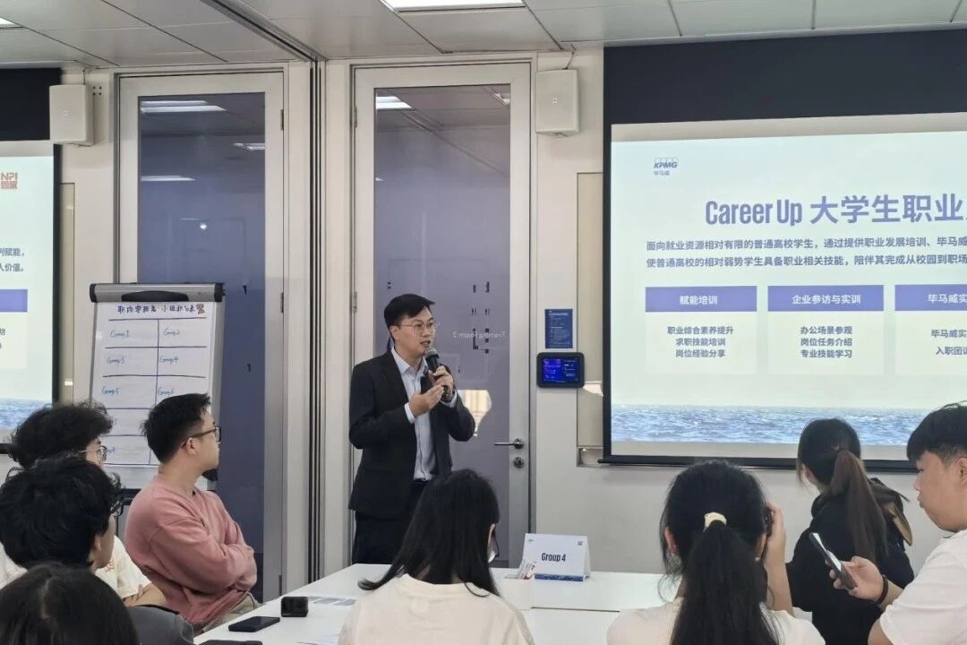 在毕马威工作人员引导下,同学们分组参观办公区域。开放式工位布局、数字化协作平台、中英文双语标识牌,无不彰显国际化专业服务机构的特质。在员工休闲区,同学们看到了更衣室、咖啡角,Bubble Huang介绍:“毕马威倡导劳逸结合的工作理念,通过完善的配套设施帮助员工保持良好工作状态。”同学们还近距离观察了审计团队的日常工作场景,对实务操作有了直观认识。