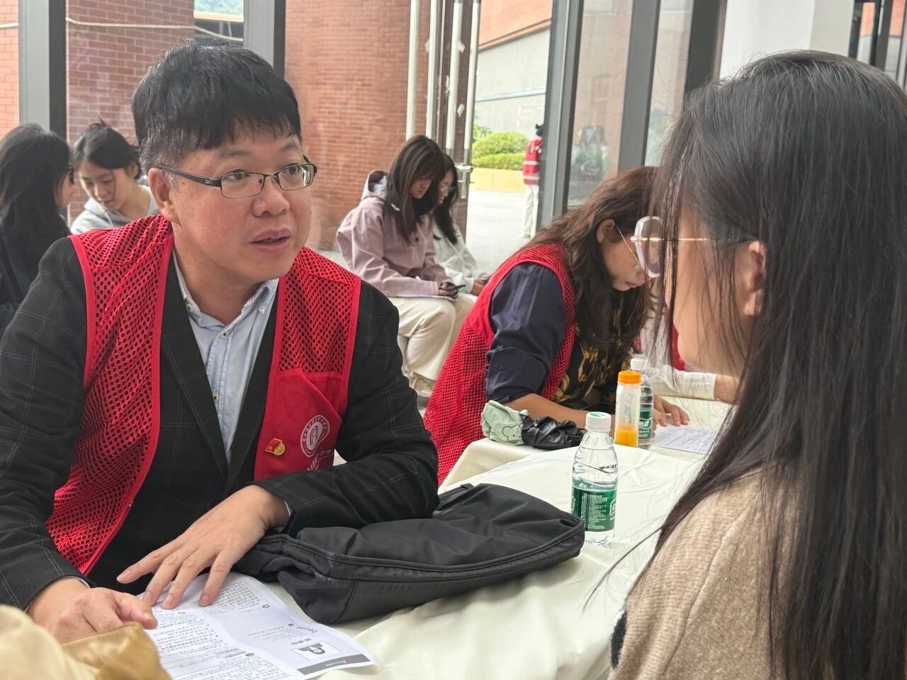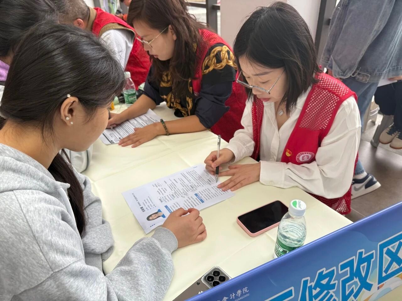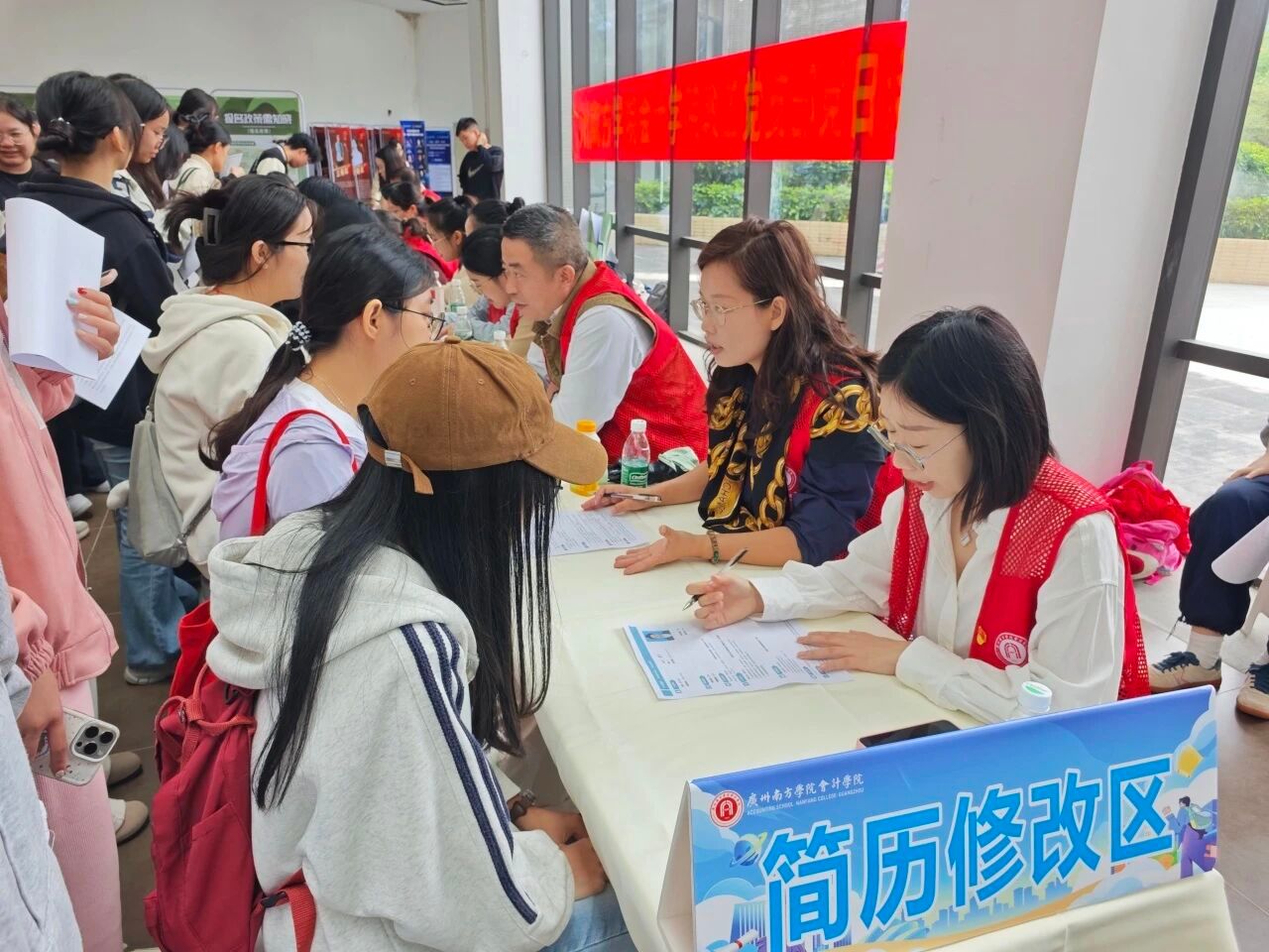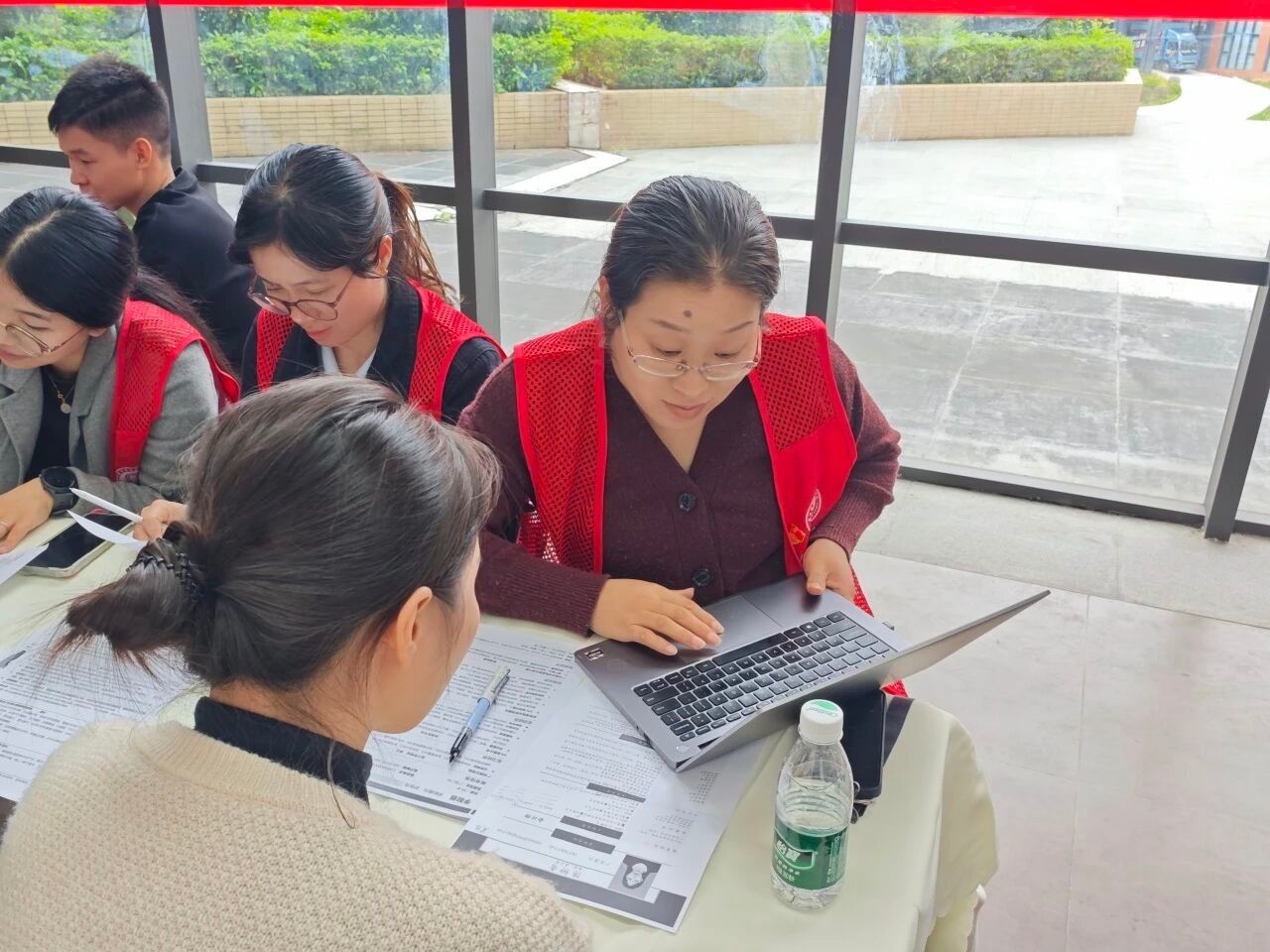 在招聘会现场,党员师生以专业与奉献为核心力量,为毕业生暖心护航。志愿者骨干提前到岗,高效完成标准展位布置、指引物料分发和企业资料复核等工作。党员教师精心梳理不同行业的简历撰写规范,结合职场需求为学生提供了精准、实用的就业导航。
