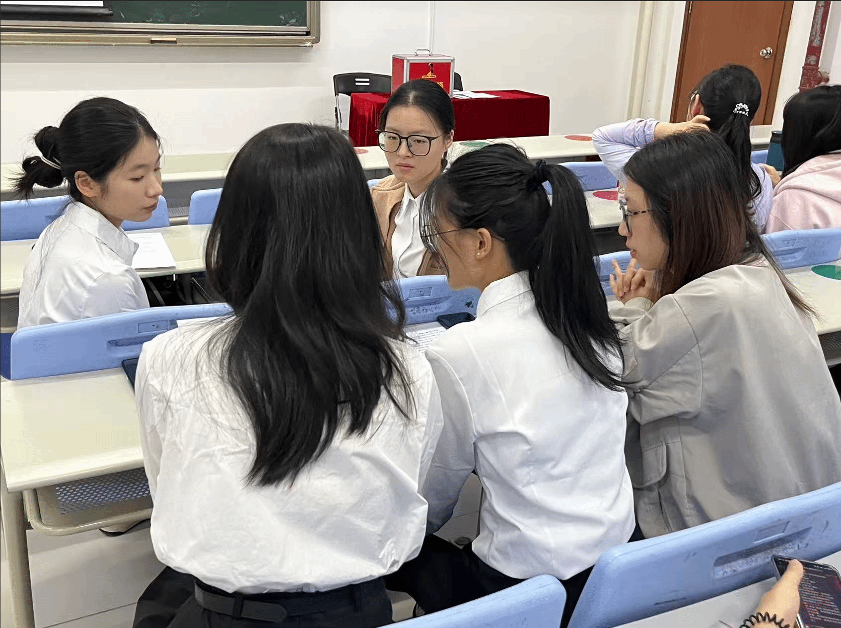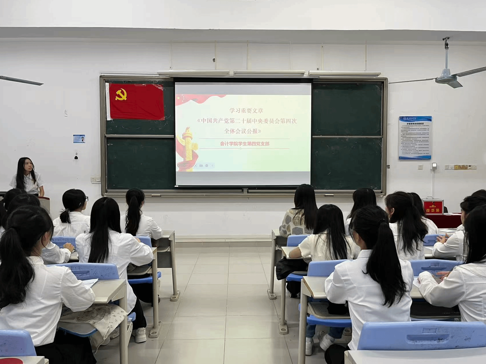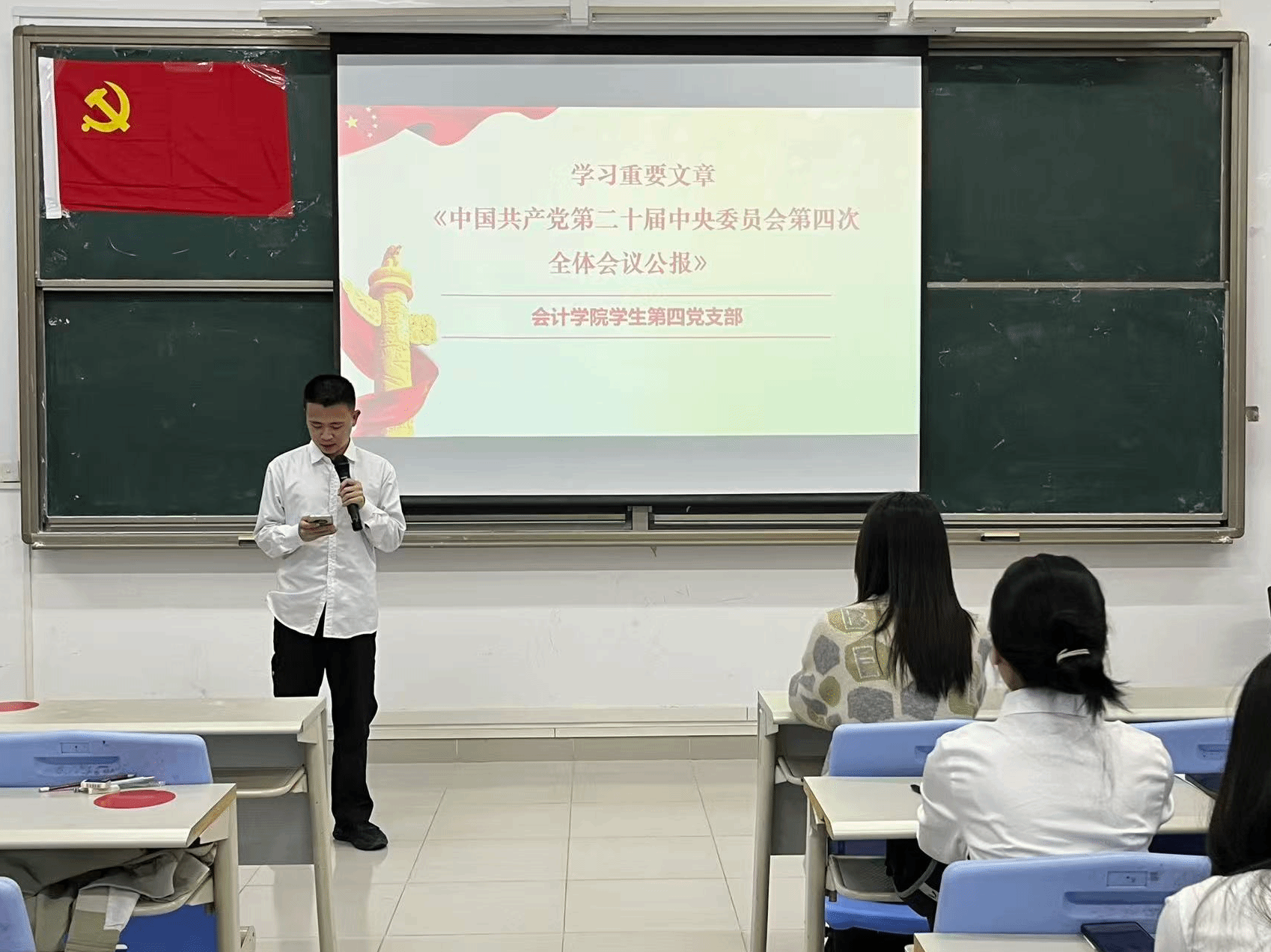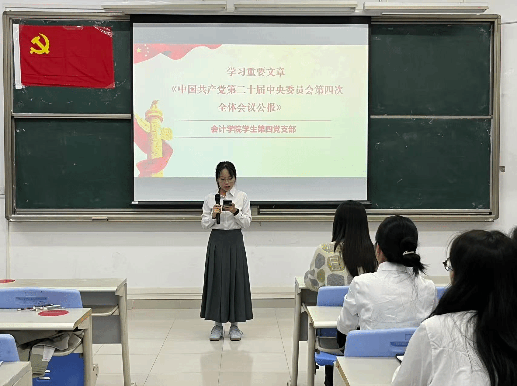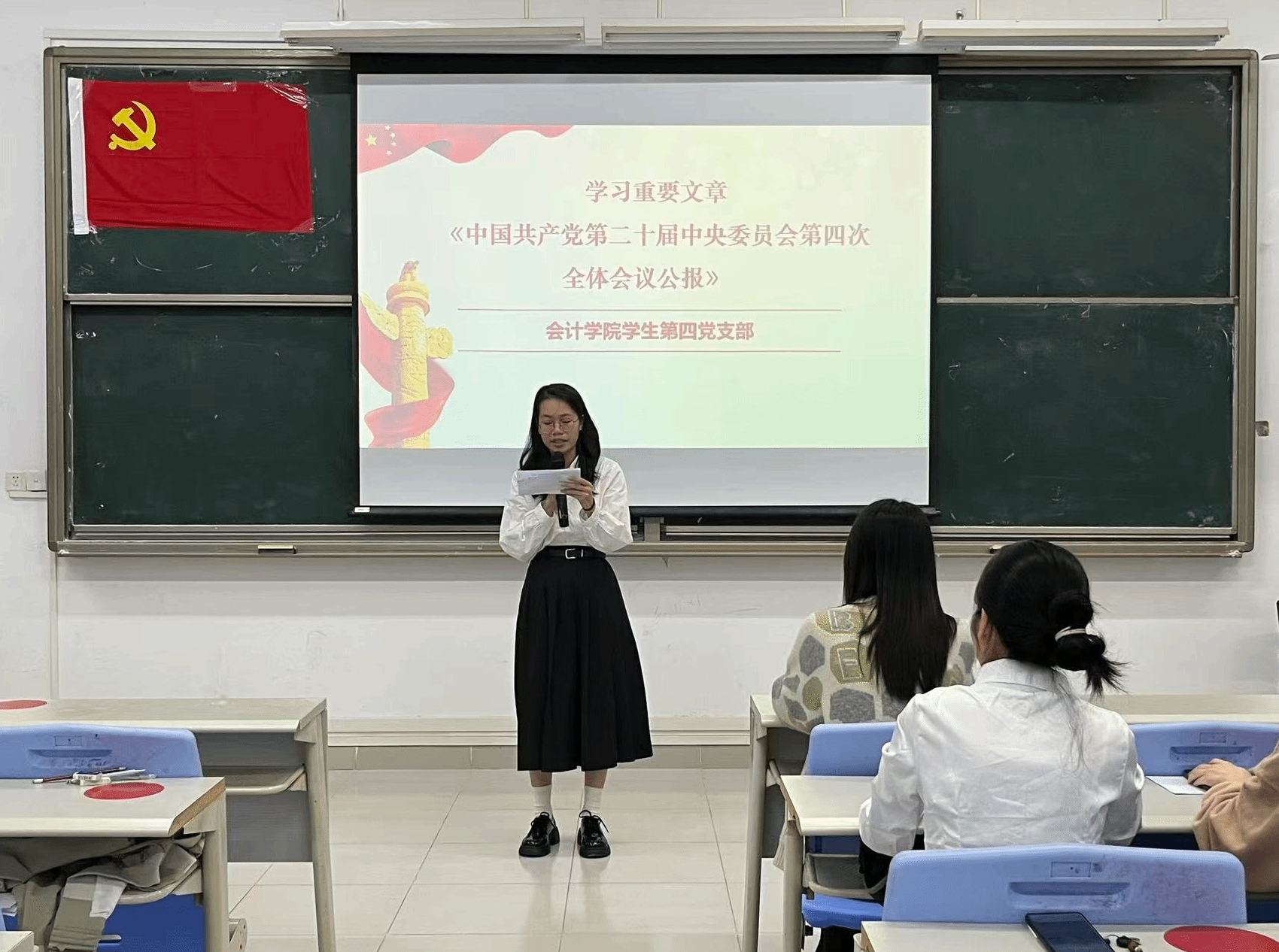 太阳成集团tyc7111学生第四党支部以“学思想、强党性、重实践、建新功”为主题召开组织生活会。组织生活会的第一环节为11月份第一议题的理论学习研讨,以党小组为单位学习重要文章—《中国共产党第二十届中央委员会第四次全体会议公报》,并进行小组讨论,各党小组代表依次有序上台发表学习心得。