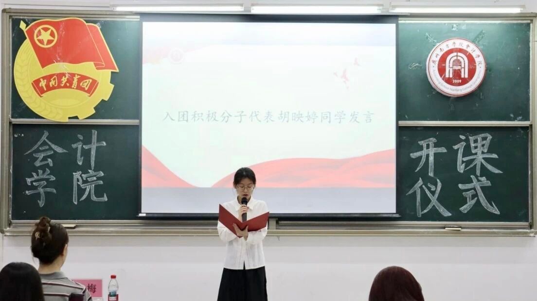 入团积极分子代表胡映婷同学发言。她表示,中国共产主义青年团是先进青年的组织,加入它既是荣誉更是责任。作为一名入团积极分子,应珍惜此次团校培训机会,坚定理想信念、锤炼过硬本领、积极服务奉献,努力成长为担当民族复兴大任的时代新人。