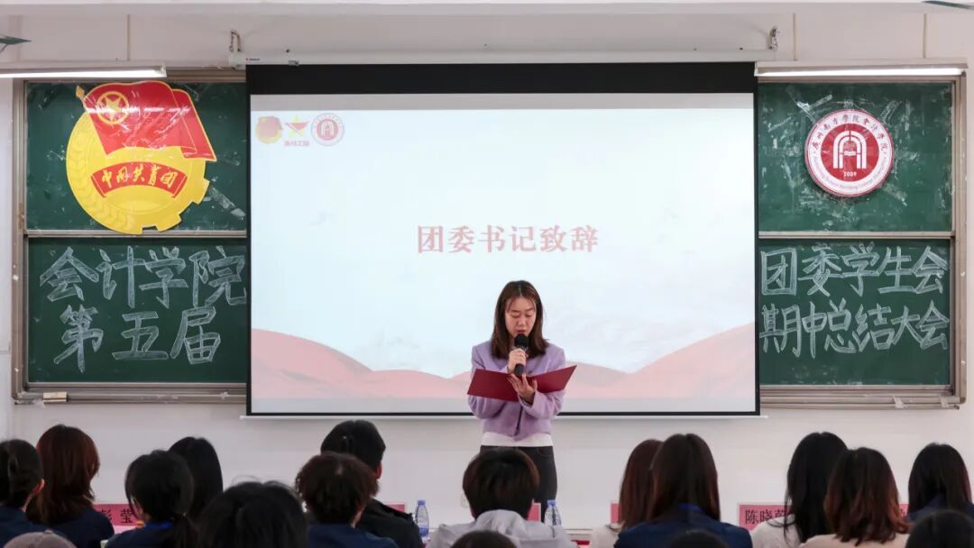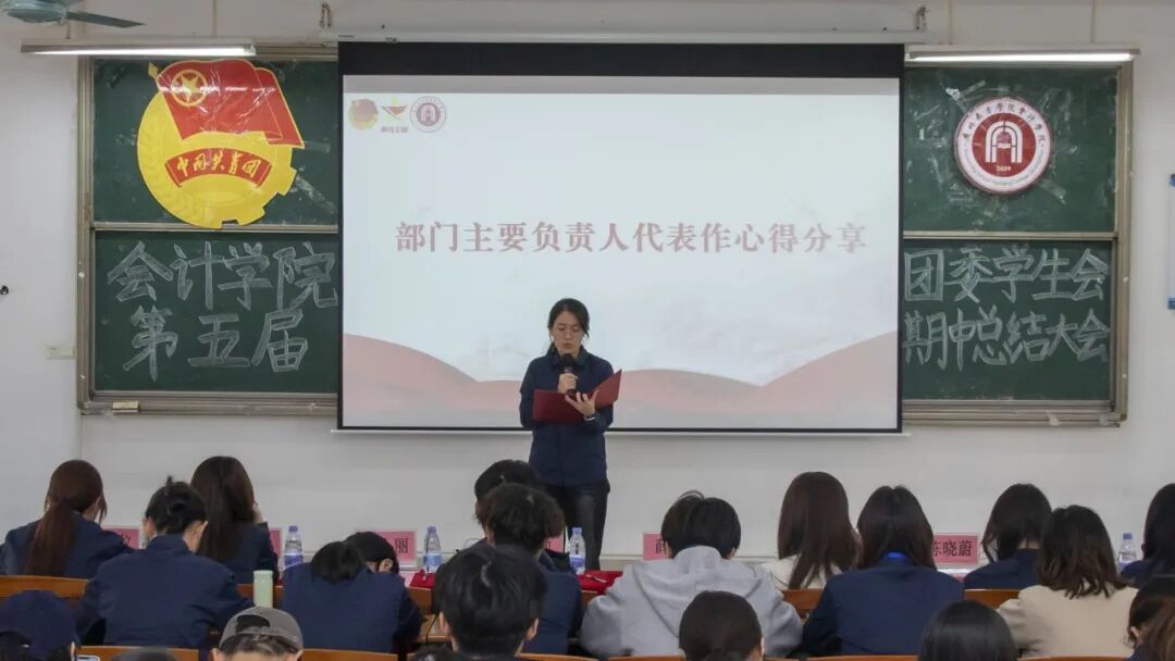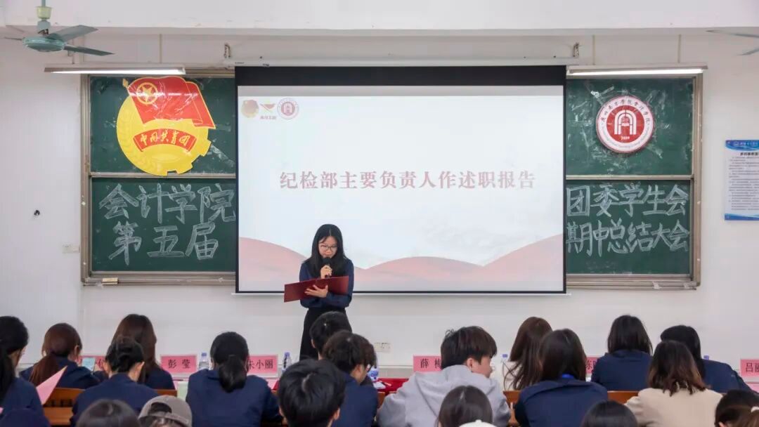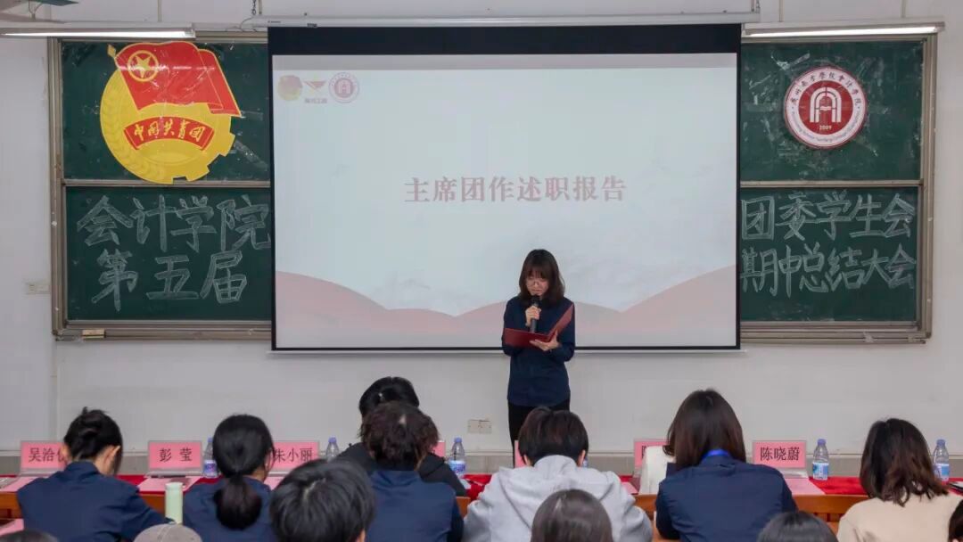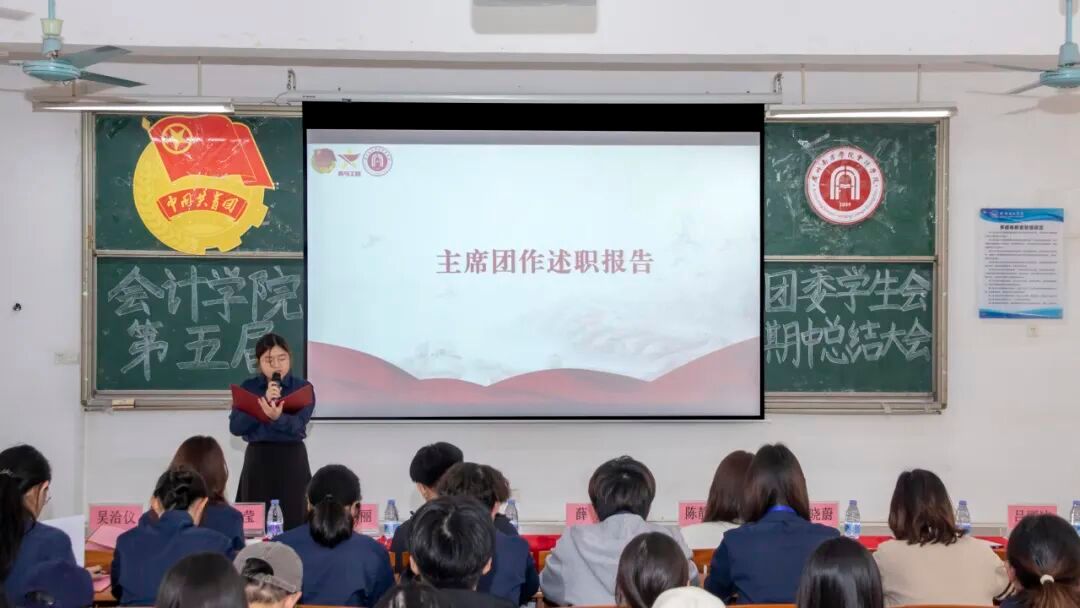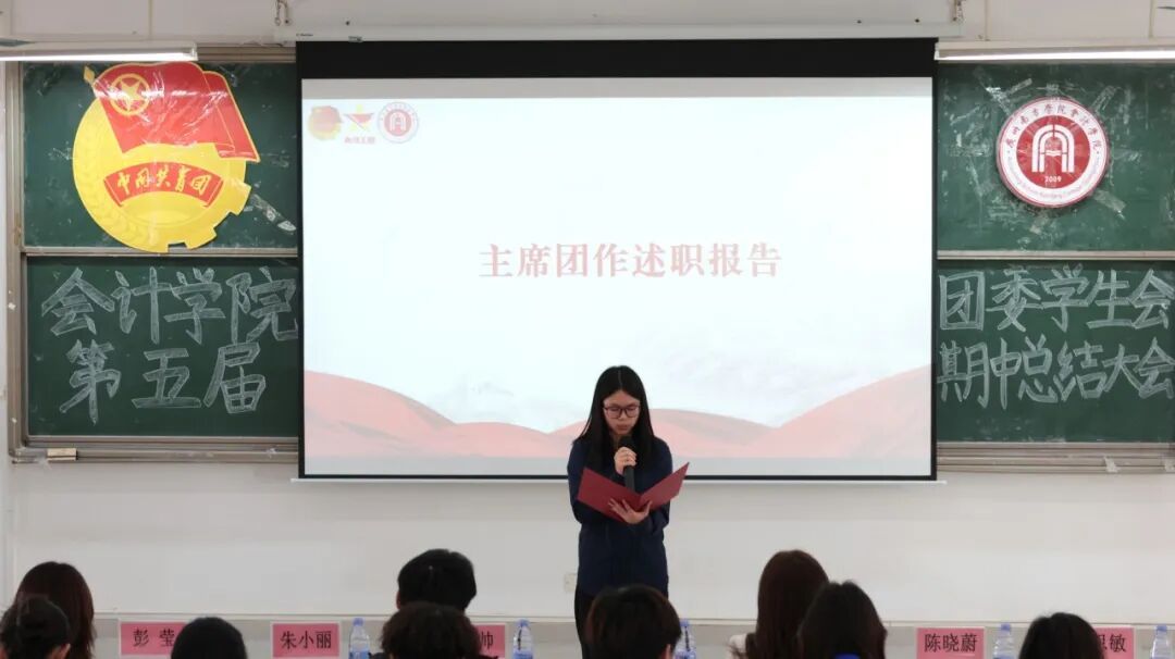 主席团成员吴洽仪、彭莹与团委学生兼职副书记吕丽冰、黎思敏依次作本学期工作述职汇报。汇报围绕工作成效、存在问题与改进方向三个层面展开,在系统总结阶段成果的同时也客观指出了当前工作中存在的不足,如活动执行精细化程度有待提升、应急响应机制不够健全、部门协同与学生积极性仍需加强等。针对以上问题,她们提出了加强过程复盘与督导、推动跨部门联动协作、优化制度保障与培训体系、完善激励机制等一系列具体改进措施。最后,她们号召全体成员保持热情、务实进取,协力提升团学工作的整体水平。