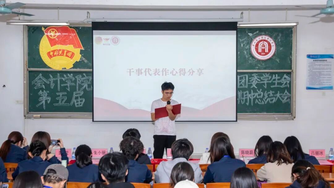 干事代表——组织部的陈铭心与李向颖分别上台发言。陈铭心同学结合自身参与活动策划与组织的实践经历,回顾总结了在工作中的收获与成长,分享了在统筹协调与细节落实中积累的经验。李向颖同学则以参与的志愿服务与义教活动为切入点,讲述了在实践中深入社会、服务他人的真切感悟。两位代表的发言朴实恳切、情感真挚,展现出团学成员在实际工作中学习、在服务同学中收获成长的踏实足迹。