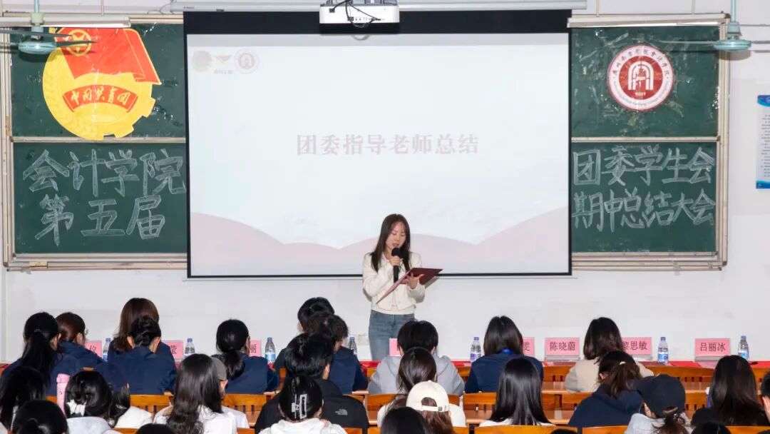 团委指导老师陈静雯对本学期团学工作进行总结发言。她系统梳理并充分肯定了各部门在本学期取得的阶段性成果,同时结合实际情况指出当前工作中仍需改进的方向,鼓励全体成员继续保持进取精神,以更高标准、更强热情投身于服务同学与自我成长的实践当中。针对即将到来的考试周,她特别叮嘱大家要专注复习、诚信应考。最后,她对下一阶段团学工作的开展方向提出了指导建议并希望全体成员再接再厉,共同扎实深化学院团学各项工作。