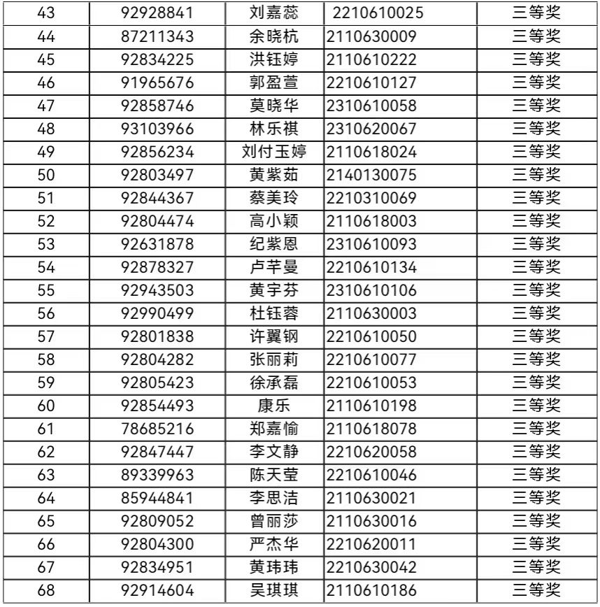 截止至 2024年5月12日,太阳成集团tyc7111共有223名同学参与比赛,经过课程学习和线上答题两个环节的激烈角逐,我院共有68名同学获得名次,其中一等奖12名,二等奖22名,三等奖34名。获奖名单公布如下(排名不分先后)。