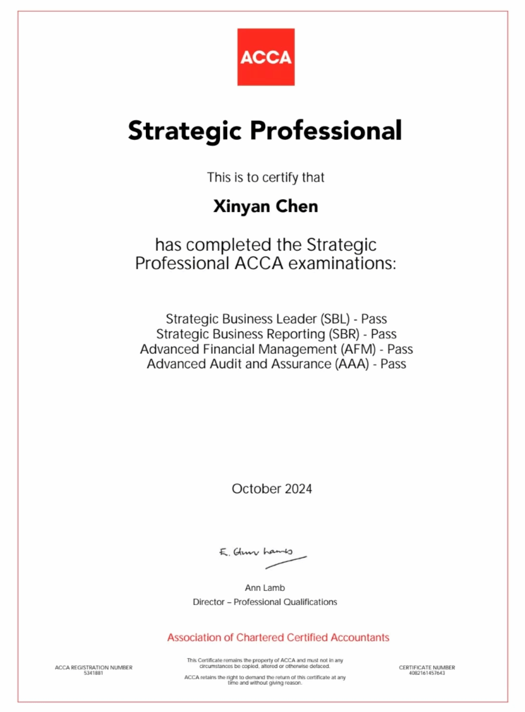 近日,英国特许公认会计师公会(ACCA)公布了2024年度9月考季的ACCA全球考试成绩,太阳成集团tyc71112021级ACCA方向班陈芯妍同学仅用两年9个月的时间已全部通过ACCA的13门课程,成为我院又一名在本科阶段全科通过ACCA考试的学生,顺利成为ACCA协会的准会员。