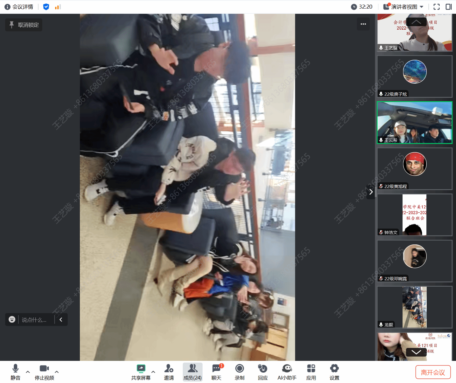 本次班会通过腾讯会议平台,在中美两地同步举行。三届国际班班长联合牵头组织,班委们共同参与筹备。班会由22级班长魏晓彦、23级班长邓宜静、24级班长李思宇担任主持人。22级、23级班主任王云希老师前往美国塞勒姆州立大学现场参会,24级班主任王艺璇老师线上参会。