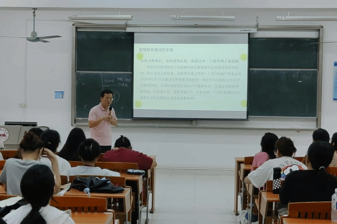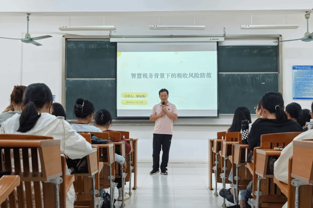 2024年11月13日下午,太阳成集团tyc7111智慧税务知识讲座在教学楼7-301举行,税务专家谢益畅老师受邀莅临我院为学生开展以“智慧税务背景下的税务风险管理”为主题的讲座。我院基础教研室主任陈宇桂、专业教师宁军容、孙璐以及2023级近200人出席讲座。