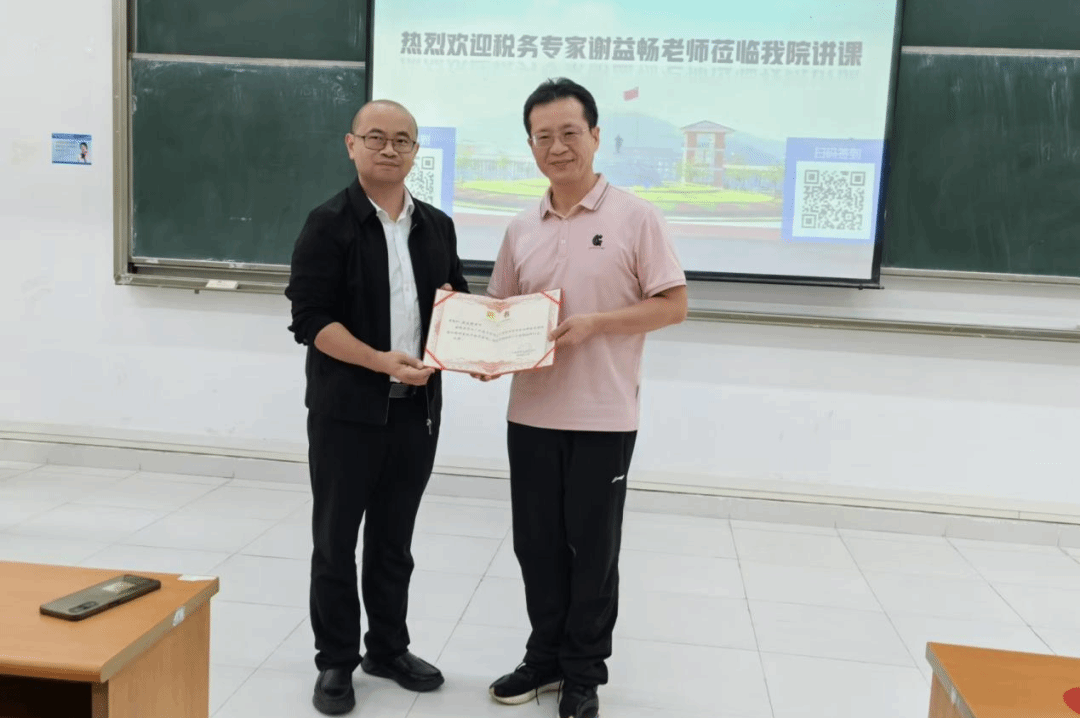 讲座正式开始之前,陈宇桂主任代表学院聘请谢益畅先生作为学院的财经类专业法律课程虚拟教研室校外导师,并为其颁发了聘书。谢益畅先生是国家注册税务师,原广东省地方税务局“六个一百"税政类专业人才库成员、稽查岗位标兵、稽查局专业队成员、省局兼职教师,国家税务总局先进工作者,江门市人民政府勤廉先进工作者,五邑廉洁清风先进事迹报告会勤廉兼优先进个人。多次为省内外税务机关授课。参与撰写学术论文数篇,在国家、省级经济类期刊公开发表,出版《房地产企业三大税种及关键风险点》一书。