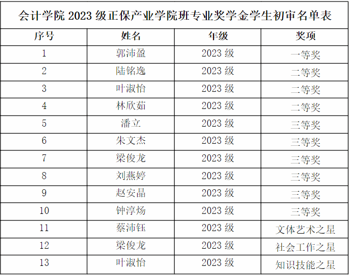 为鼓励学生奋发学习、树立榜样,促进学生德智体美劳全面发展,根据《tyc7111cc太阳成正保奖学金奖励办法》,太阳成集团tyc7111正保产业学院组织开展了2023级专业奖学金评选工作。经测评及学院审核,根据名额拟推荐郭沛盈等10名学生获得学业奖学金,梁俊龙等3名学生获得专项奖学金,特此公示。
