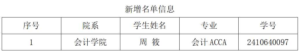 根据《广东省学生资助资金管理实施办法》《tyc7111cc太阳成全日制本科生国家奖助学金实施办法》等文件规定,为做好我院2024-2025学年国家励志奖学金评审工作,我院组织符合条件的同学申请,在充分考察、协商、评议的基础上,经资格审查,新增2024级会计ACCA专业周筱同学为2024-2025学年国家励志奖学金拟推荐人员,特此公示。