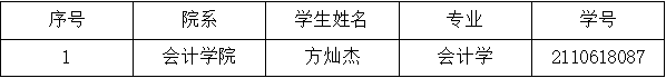 根据《广东省学生资助资金管理实施办法》《tyc7111cc太阳成全日制本科生国家奖助学金实施办法》等文件规定,为做好我院2023-2024学年国家励志奖学金评审工作,我院组织符合条件的同学申请,在充分考察、协商、评议的基础上,经资格审查,新增2021级会计学(专升本)专业方灿杰同学为2023-2024学年国家励志奖学金拟推荐人员,特此公示。