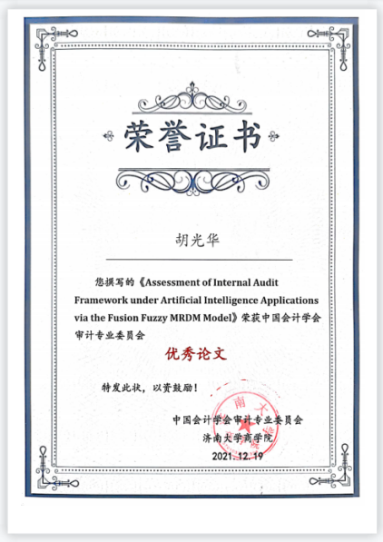 12月18-19日,在济南大学通过线上召开的中国会计学会审计专业委员会2021学术年会上,我院胡光华副教授撰写的论文“Assessment of Internal Audit Framework under Artificial Intelligence Applications via the Fusion Fuzzy MRDM Model”获得本次年会的优秀论文奖。