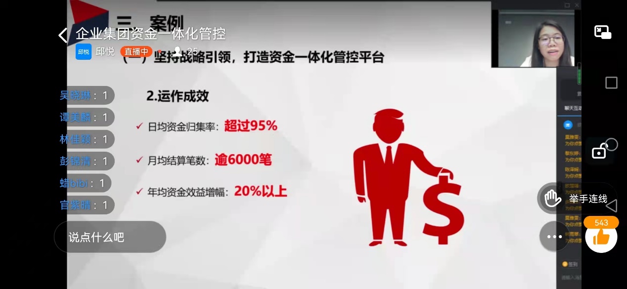 在第三部分中,陈芷筠老师以岭南集团为例,为同学们讲解了其资金一体化管控平台的运作模式和运作成效。另外,陈老师还提到了岭南集团通过建章立制规范平台运作、建立资金支付预算控制机制、建立资金池三级动态备付体系等方式构筑资金一体化风险防控体系。