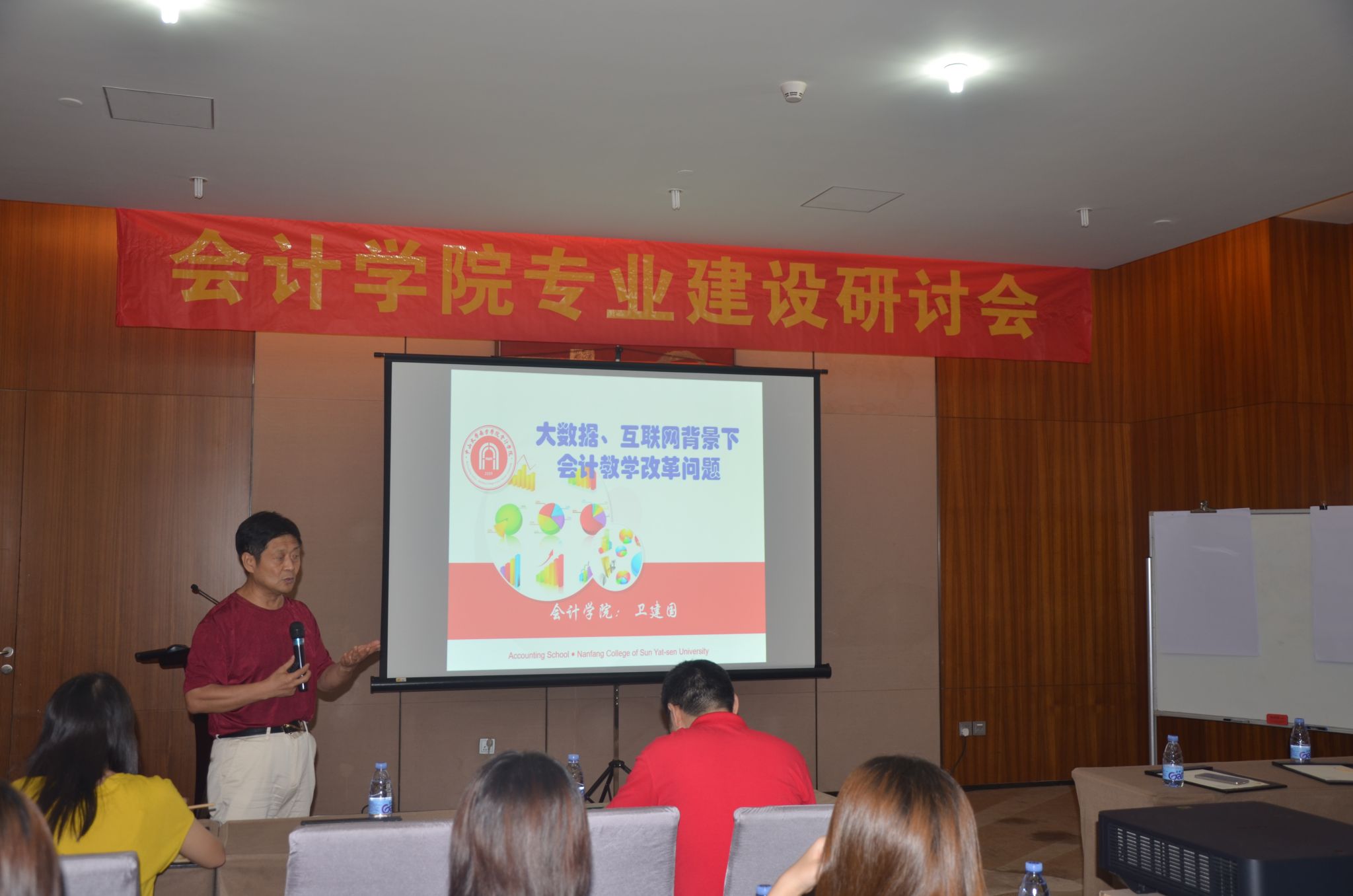 接着,我院执行院长卫建国做了“大数据、互联网背景下会计教学改革问题”专题报告,他从会计教学的时代挑战及学科面临的危机等方面展开主题。他指出,“危机同时也是机遇,只要旧与新过程中存在创新空间,会计就不会消亡。”对此,卫院长提出了三点基本应对思路:紧跟时代步伐、坚持系统性和创新性。在具体应对措施的介绍中,卫院长以自身在中山大学管理学院的工作经历为例,形象地阐释了自己对会计学视角下如何应对时代挑战与危机的几点想法,引人思考。之后,卫院长对我院会计学专业申报“双万专业”的相关情况和应用型转型试点的验收情况进行了通报。他指出,目前,我院会计学专业已申报国家“双万专业”,被广东省推荐为“国家级一流本科专业建设点”,参加国家评审。
