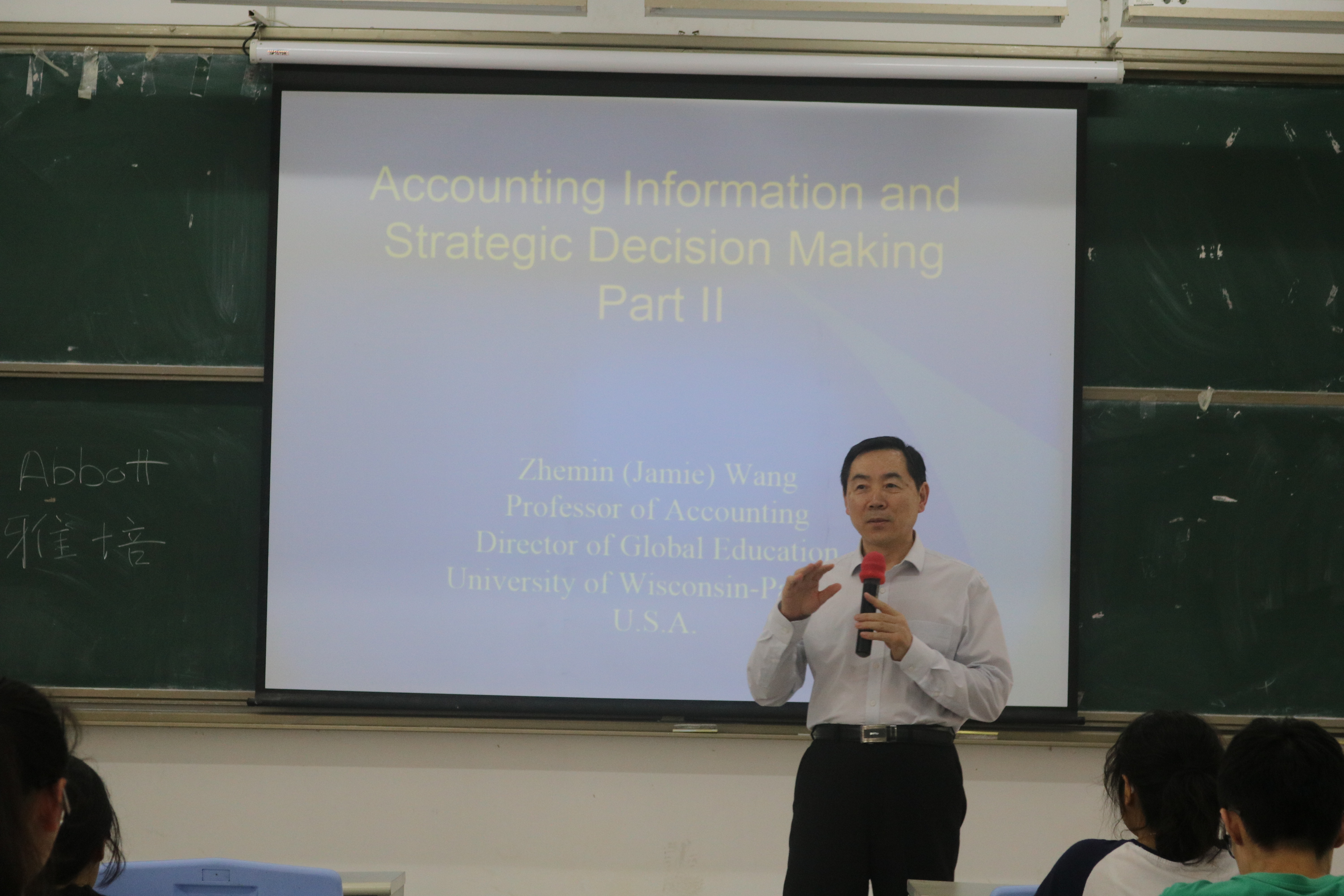 5月18日,太阳成集团tyc7111《财经名家讲坛》系列讲座顺利开讲。我校讲座教授,美国会计学专家,美国威斯康星大学教授王哲民担任本次讲座主讲嘉宾,为我校师生带来题为”Accounting Information & Strategic Decision Making” 的讲座。讲座分上午和下午两讲进行,由太阳成集团tyc7111办公室主任曾婷婷老师主持。