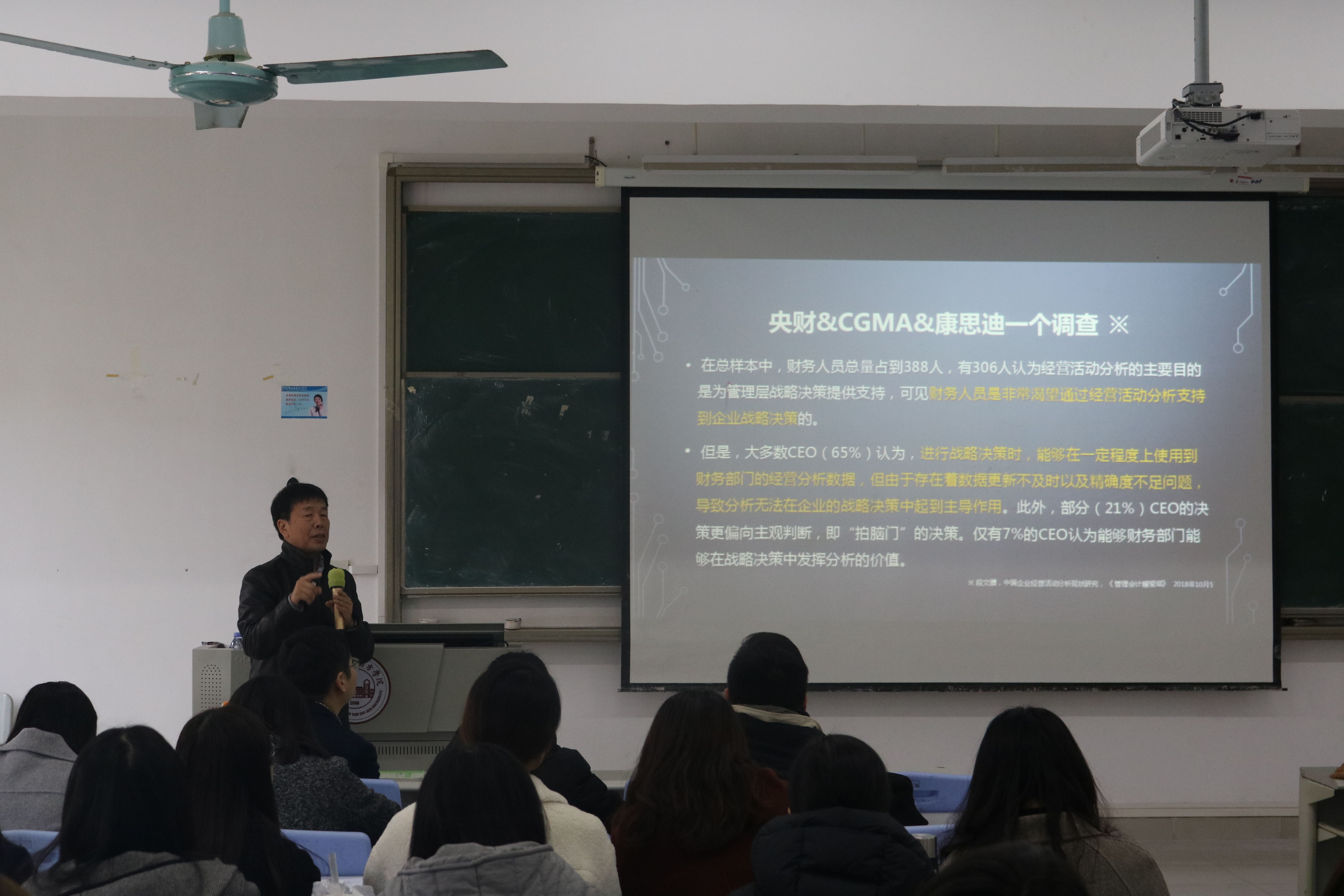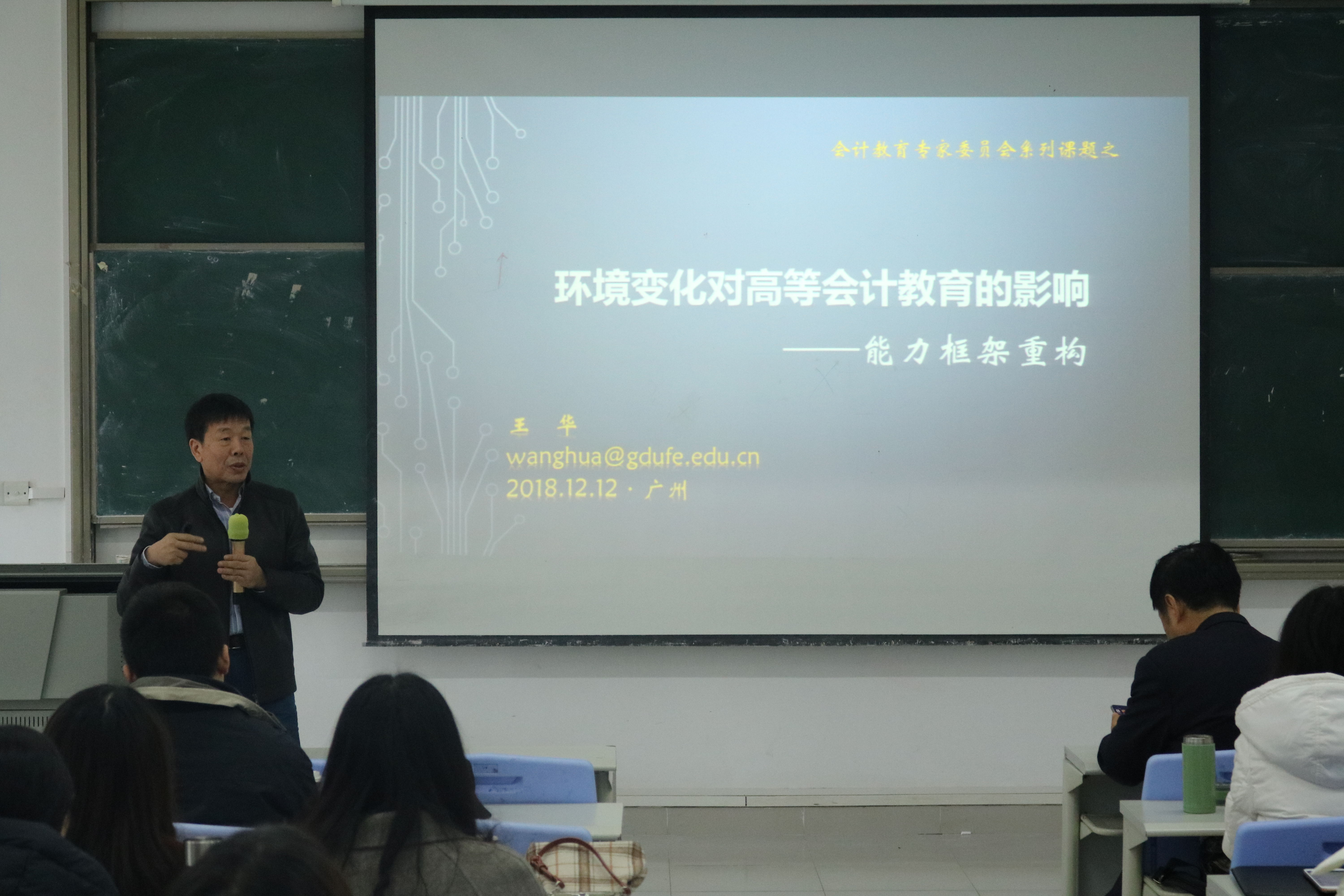 2018年12月12日下午,原广东财经大学校长王华教授应邀做客太阳成集团tyc7111,为我院专职教师带来了一场题为“数字经济时代会计专业的融合与重构”的精彩讲座。太阳成集团tyc7111执行院长卫建国、副院长董成杰、张媛、办公室主任宋得福及全体老师参加了这次讲座。讲座由执行院长卫建国主持。