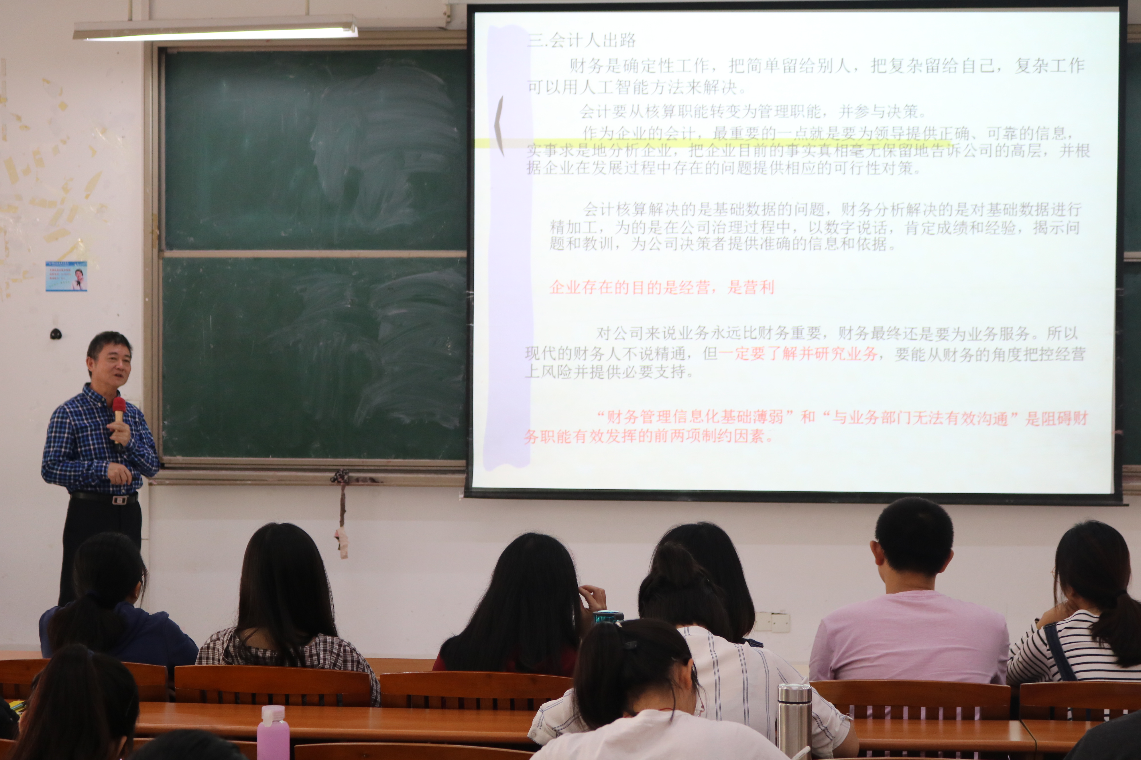 讲座开始,张晓峰教授分别从会计现状,环境变化对会计的要求及财会人员的出路三方面进行讲述。他指出,会计专业一直是个热门专业,其就业率高,就业方向广,深受学生欢迎。同时,会计的工作现状是入门简单,精通难,并且大多数为青年骨干,从事的也多为核算会计工作。张教授以“开好票,做好账,报好税”一句话总结了当下财会人员基本的工作要求。此外,张教授表示,从传统的手工时代到如今的智能时代,会计在经历一次又一次的变革,传统会计早已不适应当今环境。这就要求当下财会人员除了要学会适应环境的变化,还要主动研究相关业务,在学习专业知识的基础上,也要了解与财会相关的其他方面的知识。最后,张晓峰教授通过举例,详细说明了财务管理信息化基础薄弱、业务部门无法与财务部门有效沟通是现代财务职能无法有效发挥的两大因素,因此,财会人员必须提高信息整理、分析及挖掘的能力,掌握机器人无法做到的技能。
