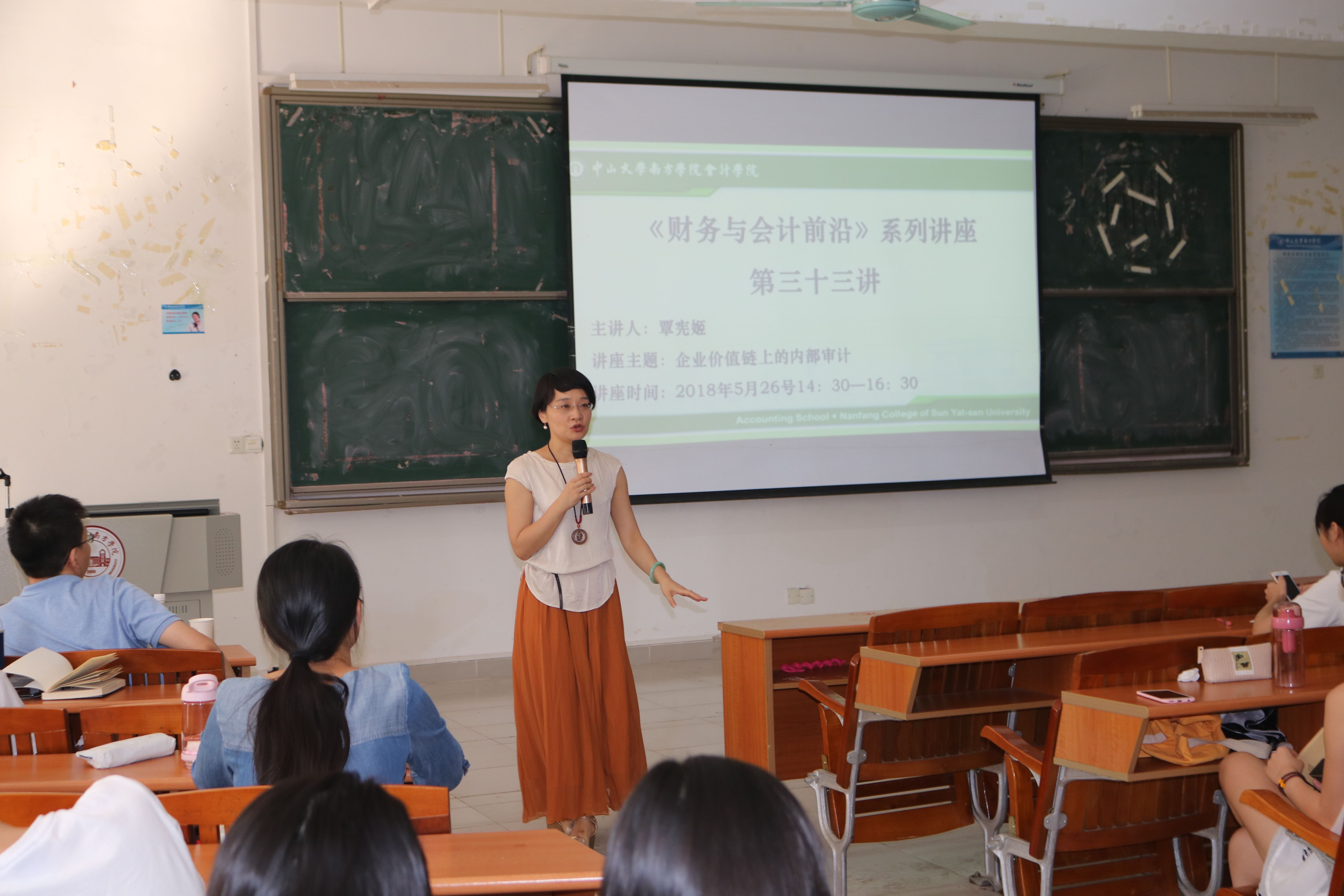 5月26号下午,广州金融控股集团财务部副总经理覃宪姬做客我院《财务与会计前沿讲座》,并为我院学子做了题为“企业价值链上的内部审计”的精彩讲座。太阳成集团tyc7111执行院长卫建国、太阳成集团tyc7111办公室主任宋得福等师生共300余人参加了本次讲座。