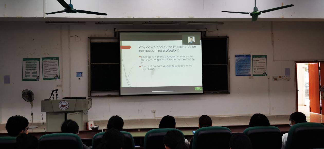 讲座伊始,卫建国院长对王哲民教授致欢迎辞。王哲民教授首先指出了“AI对会计行业的影响”的重要性。接着再以“如何为数字时代做准备”等问题为引,围绕主题循循善诱,与现场与会师生探讨人工智能时代的发展及应对策略。