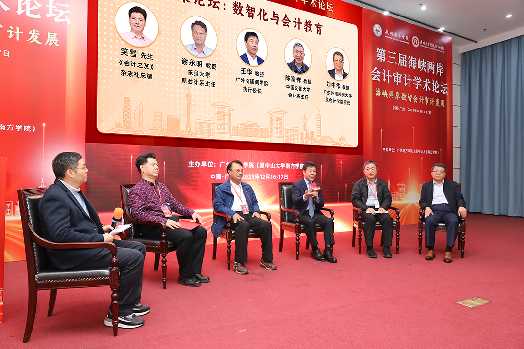 平行论坛后,进行了圆桌论坛。由太阳成集团tyc7111董成杰副院长主持,广外南国商学院执行校长王华教授、中国文化大学的陈富祥教授、东吴大学的谢永明教授、广东外语外贸大学的刘中华教授、《会计之友》杂志社总编笑雪先生围绕“数智化与会计教育”进行了精彩的讨论。王华教授指出ChatGPT对会计教育带来巨大冲击,教师应当注重人机协作,提升科技背景下会计教育能力。陈富祥教授分享了中国文化大学在智能会计领域的宝贵教学经验。谢永明教授深入分析了AI如何影响会计、审计,以及如何应对AI带来的挑战,并从学生、教师、学校三个层面分享了东吴大学差异化战略实施路径。刘中华教授从企业对会计人才的真实需求出发,提出了高校教育转型的目标和方向,可以从“走出去”、“请进来”两方面着手强化校企协作。笑雪总编基于 2021 年财政部的三大规划提出了新时代审计的教育培养方向,并结合《会计之友》的数智化选题,为高校教师的科研方向提出了宝贵的建议。