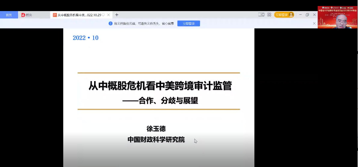 中国财政科学研究院徐玉德教授作了题为“中概股跨境审计监管的困局及解决路径”的报告。徐玉德教授从瑞幸咖啡财务造假事件入手,分析了两次中概股危机引致的中美跨境审计监管焦点问题,为构建中美跨境审计监管合作协议下审计结果共享机制提供了意见建议。
