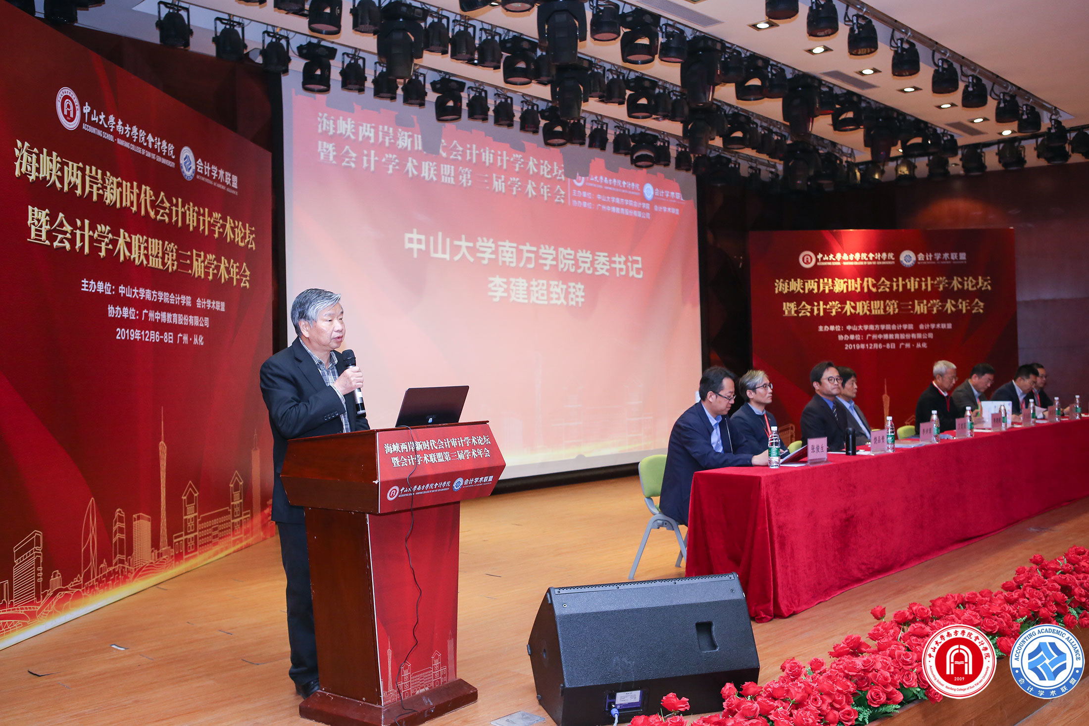 开幕式上,中山大学南方学院党委书记李建超上台致辞。他向参加本次大会的专家学者表示热烈的欢迎,向本次会议的主办方、协办方及长期以来支持我校发展的同仁表示衷心感谢。他指出,学校将以本次大会为契机,广纳真知灼见、广进学术资源、广交学术人才,增进友谊,激励创新共同为会计事业贡献智慧和力量。随后,中山大学南方学院太阳成集团tyc7111执行院长卫建国上台发言,卫院长在发言中分享了中山大学南方学院太阳成集团tyc7111成立10年来的发展历程。他表示,当前我们正面临着伟大的变革时代,数字经济突飞猛进地发展,传统会计遭遇挑战,会计学科可能将会出现脱胎换骨式的变革,希望通过本次会议共同讨论审计会计的未来发展。台湾东吴大学会计学系主任李坤璋教授在发言中表示,现如今会计面临的环境越来越复杂,会计是审计的基础,无法洞察会计的变化就无法掌握审计。海峡两岸的合作可以为会计审计的工作开启更多属于华人地区的专业领域。会计学术联盟联合发起人李高波博士则在发言中表示,用爱心服务会计人的成长是会计学联盟的使命,会计学联盟将会继续高举会计前辈思想的旗帜,传递学术之火、育人之火、爱心之火。