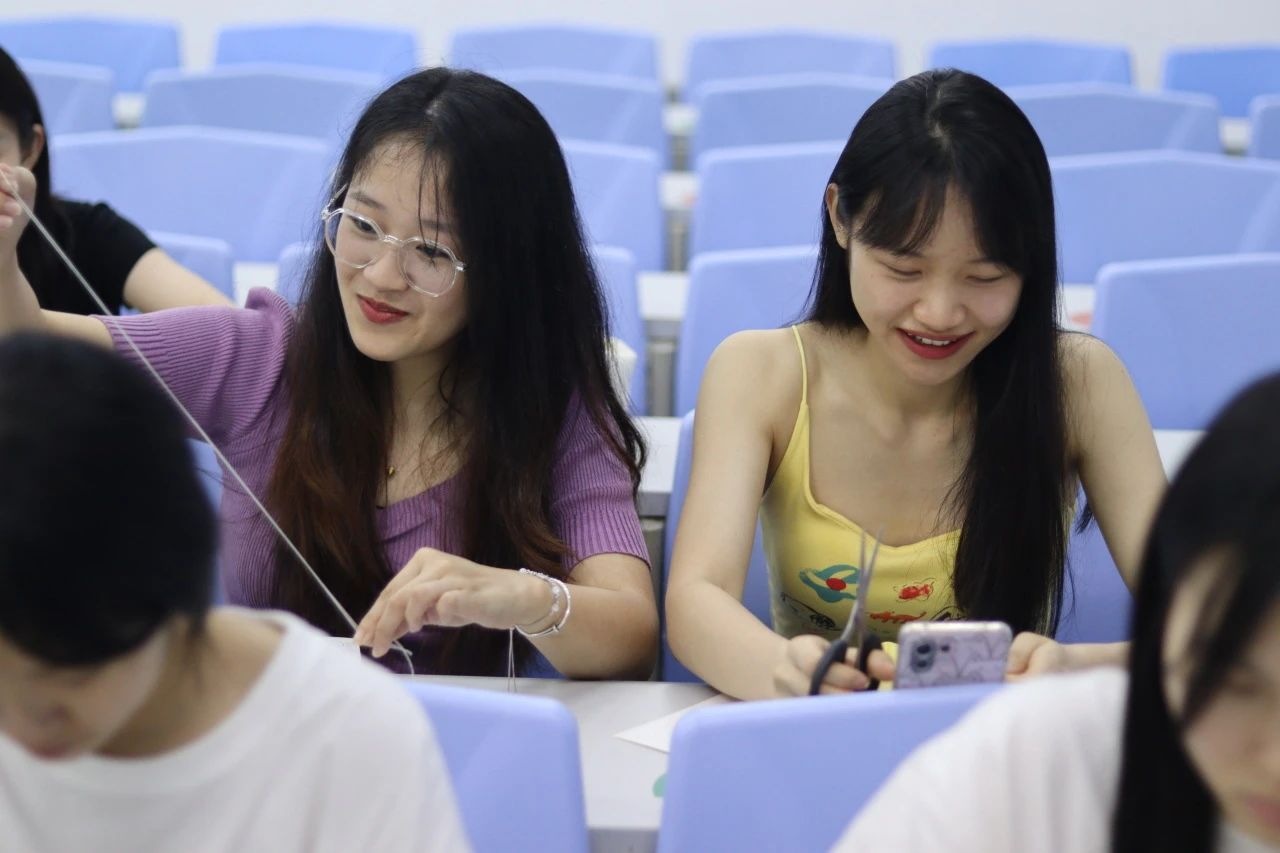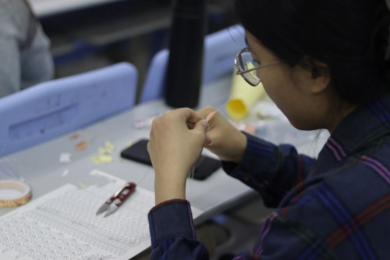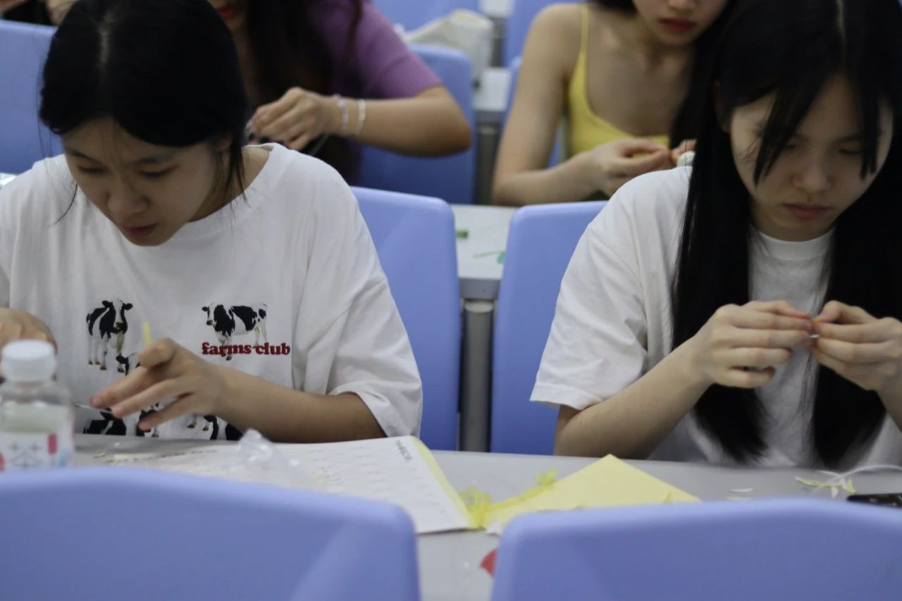 最后,在实操环节,同学们跟着视频节奏一步一步地尝试制作。起初,同学们的动作略显生疏,但在小老师的耐心指导下,大家逐渐掌握了技巧,作品也逐渐成型。最终,同学们都完成了自己的缠花作品,获得了一次独特的文化体验。