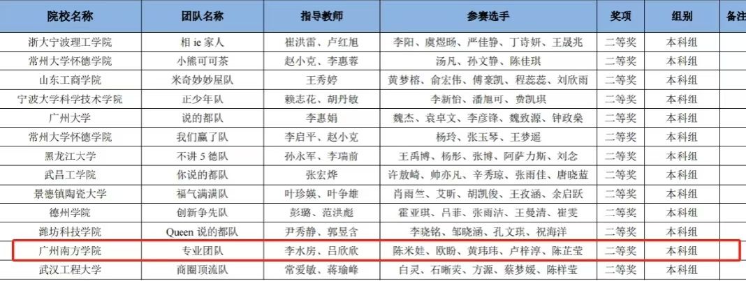 此外,陈米娃、欧盼、黄玮玮、卢梓淳、陈芷莹五名同学组成参赛队伍——“专业团队”,在李水房、吕欣欣老师指导下,荣获本次竞赛全国二等奖佳绩。