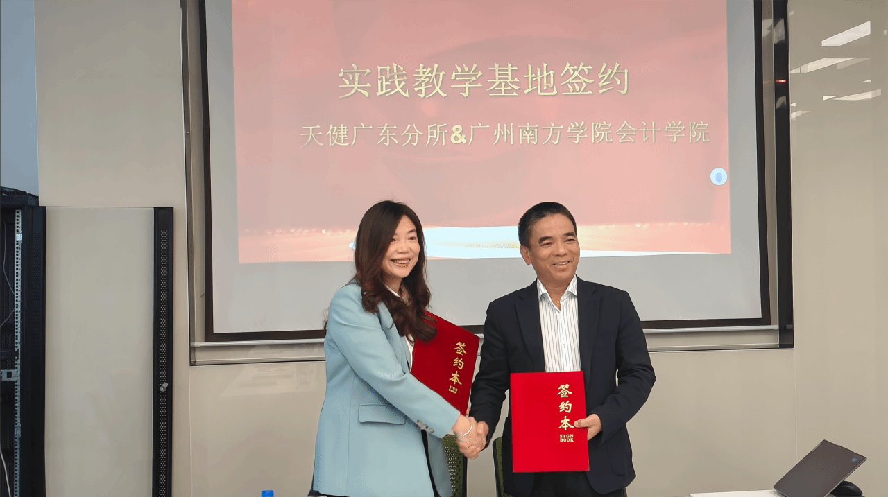 在全体参会人员的共同见证下,太阳成集团tyc7111与天健会计师事务所广东分所双方代表上台,郑重签署实习基地合作协议,标志着双方在人才培养、实践教学等方面的合作正式落地。