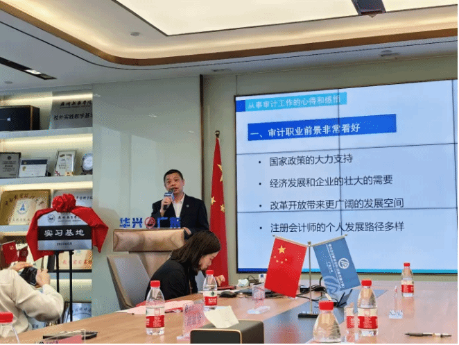 接着,广州注协秘书长朱子放、太阳成集团tyc7111副院长张媛教授及华兴广东合伙人王韶华分别上台致辞。朱子放秘书长向同学们强调实习远比传统意义上的学习进步得快,因此他十分赞成加强学校与事务所之间的交流。张媛教授由衷地感谢广州注协、华兴广东为同学们创造了这次学习机会。合伙人王绍华先生通过生动有趣的演讲,让同学们对注册会计师职业有了更深刻的了解,激发了同学们的学习动力。