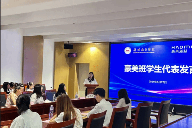 2020级“豪美班”学生代表胡洽芹同学发言。她说到,在校企合作特色班“豪美班”项目的培养模式下,同学们不仅汲取了丰富的理论知识,还通过现场参访企业的方式深入了解财务会计工作的实际操作,培养了团队合作精神和解决实际问题的能力,并感谢tyc7111cc太阳成和广东豪美新材股份有限公司共同搭建的校企合作平台带来的学习和锻炼机会,让大家得以在实践中成长。