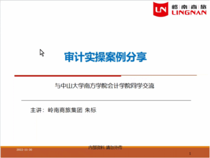 11月30日下午,广州岭南国际企业集团有限公司审计部总经理助理朱标导师应邀为我院岭南班的同学们作了一场题为《审计实操案例分享》的讲座。受疫情影响,本次讲座通过腾讯会议线上进行,太阳成集团tyc7111专职教师宁军容及全体岭南班学员参加了本次讲座。