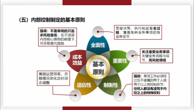 林津翘导师以《桥与栏杆》《切蛋糕博弈》两个趣味小故事引出了内部控制的定义,接着分别介绍了国内外内部控制的法规和制度以及内部控制的目的和基本特点,并着重讲解了全面性、重要性、制衡性、适应性和成本效益这五项内部控制制定的基本原则。