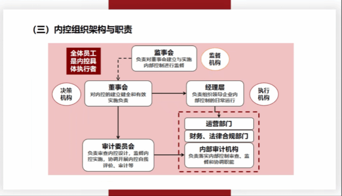 随后,林津翘导师系统地讲授了内部控制体系的基本内容,其中重点讲述了不相容职务分离控制、授权审批控制以及财产保护控制这三项主要控制措施。同时采用图文结合的形式,为同学们介绍了企业内部控制的组织机构与职责。