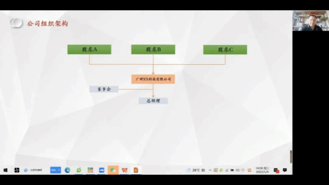 张律师首先从公司概述、创业公司股权分配方法、互联网公司创业领域合规建议三个方面讲解了创业公司的顶层架构设计问题。其中,张律师着重强调了股权分配常见误区,通过详细的案例为同学们设计企业股权结构提供了参考。针对互联网公司创业领域,张律师详细介绍了不建议同学们去试探的行业,并对其中原因进行了详尽的解释说明。