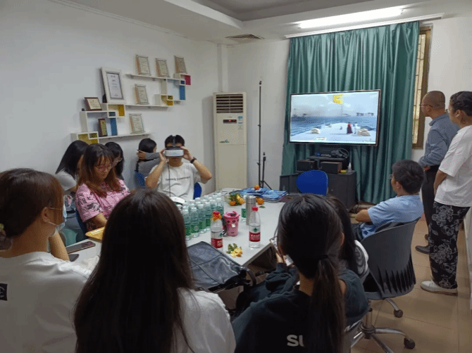 接下来,同学们来到会议室,由邓经理首先向同学们介绍公司的业务板块、发展历程、银河幻影VR品牌定位、硬件和软件产品、VR案例赏析等。接着,曾经理为同学们播放了航空航天、海洋环保、历史教育、文体旅游等主题的多部影片,同学们带上VR眼镜,通过头部转动来体验全景环绕的效果。在访谈环节,同学们向曾经理提出关于行业发展、品牌推广、客户群、产品规划等相关问题,曾经理悉心地为同学们一一解答。