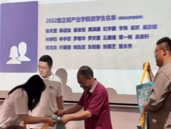 随后,杨芳芳老师详细为在座同学们解释了“正保班”班徽的设计,班徽样式将太阳成集团tyc7111和正保远程教育企业logo相结合,象征着产教融合、校企合作,也体现出同学们在未来的工作生活中乘风破浪、展翅飞翔的美好寓意。随后,在场的全体老师为同学们赠送定制礼品,礼物承载着对同学们的关怀和期望。
