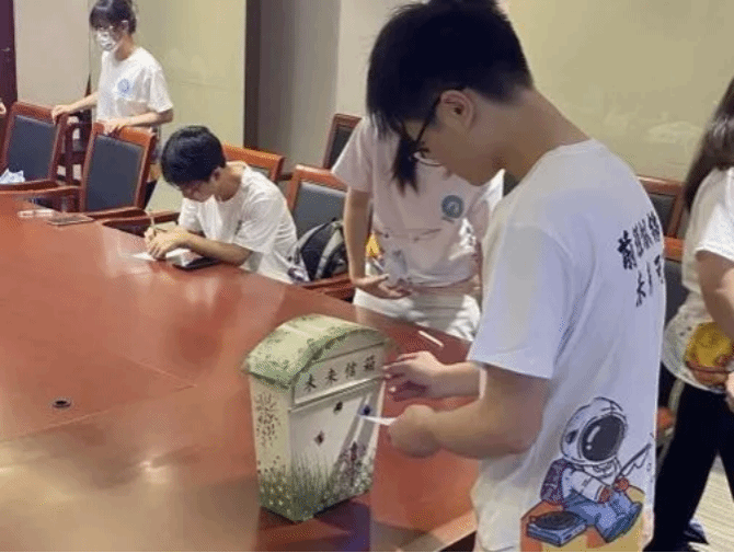 在轻快的音乐声中,同学们执笔在梦想函上许下对未来的期许,依次向未来信箱中投递。